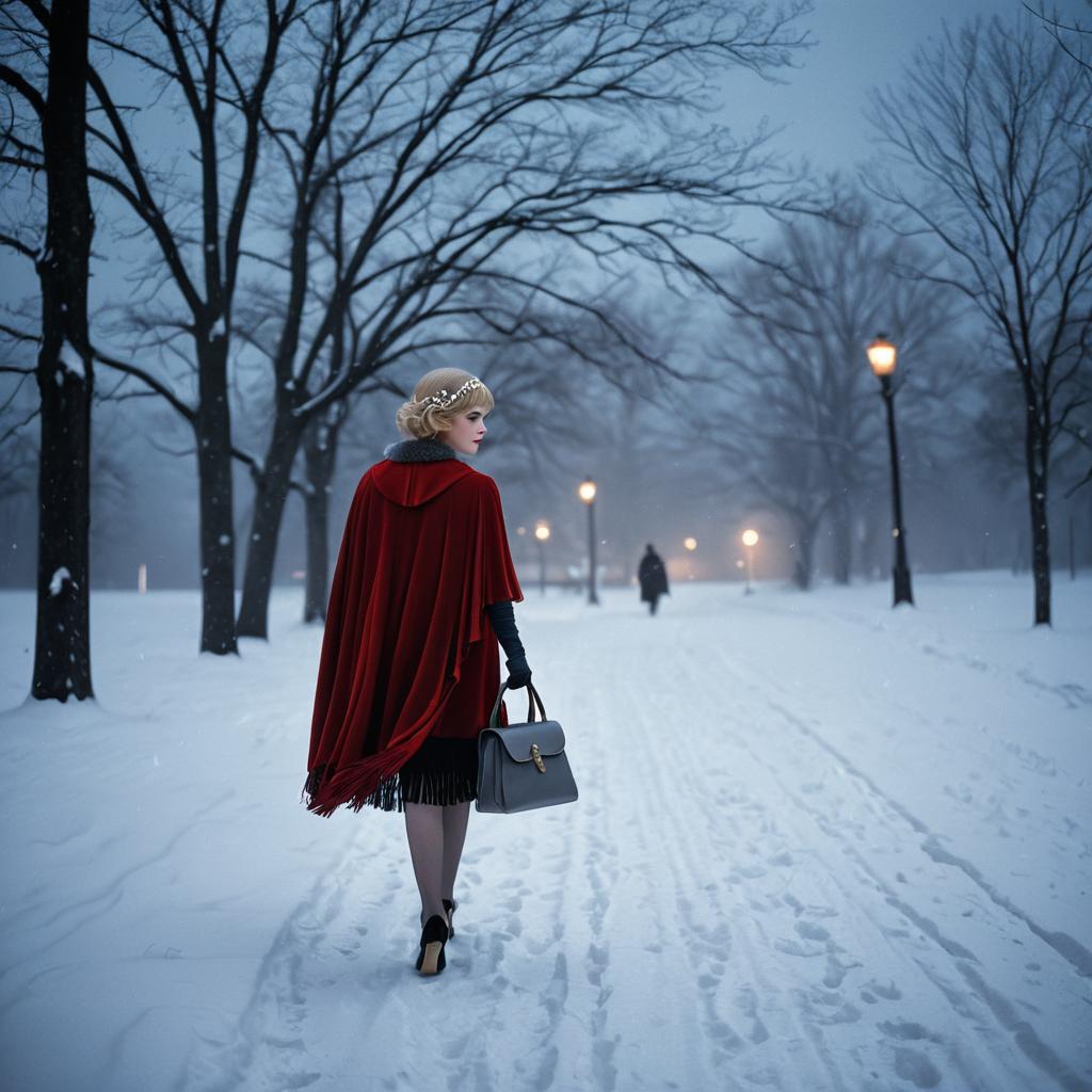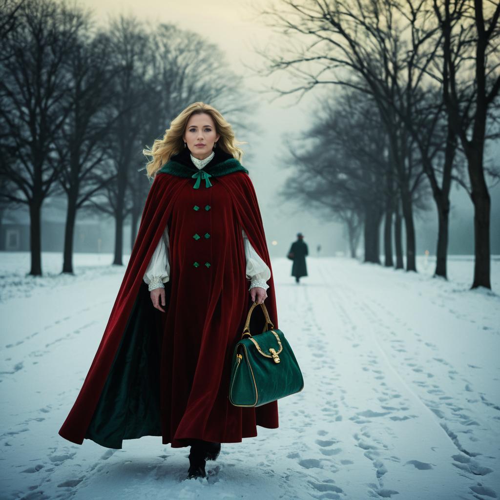 A middle-aged Victorian scholar, with golden blond hair and emerald green eyes, wearing a crimson cape, walking in the snow alone. She is pregnant and carrying a bag. Full body shot at dusk, dramatic lighting with fog, romantic atmosphere, ultra-detailed, realistic