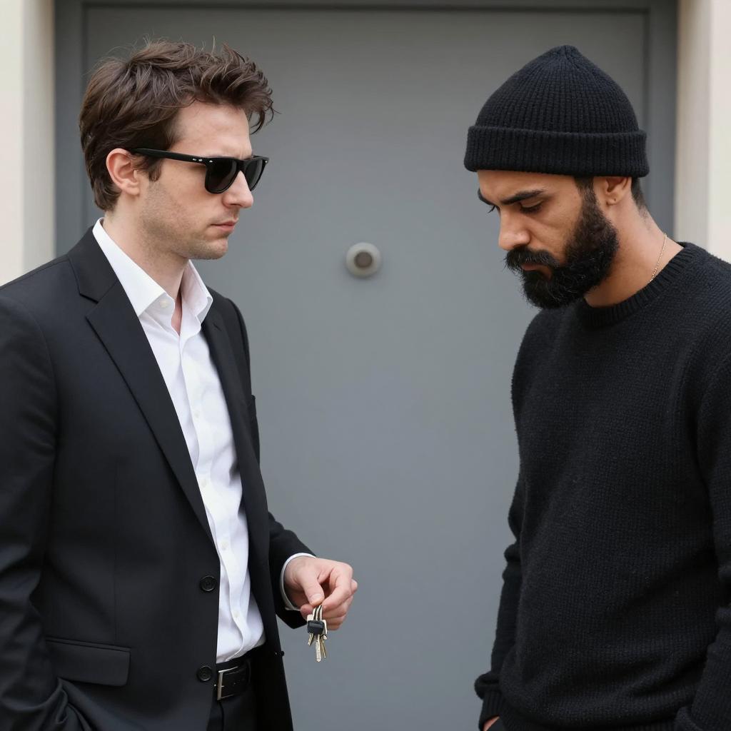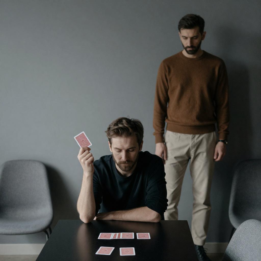 Photograph of two men in a minimalist room. One man sits at a table with cards, raising a card in his right hand. The other man stands against a gray wall, wearing a brown sweater and beige pants, looking down. Gray chairs on either side. Dim lighting.