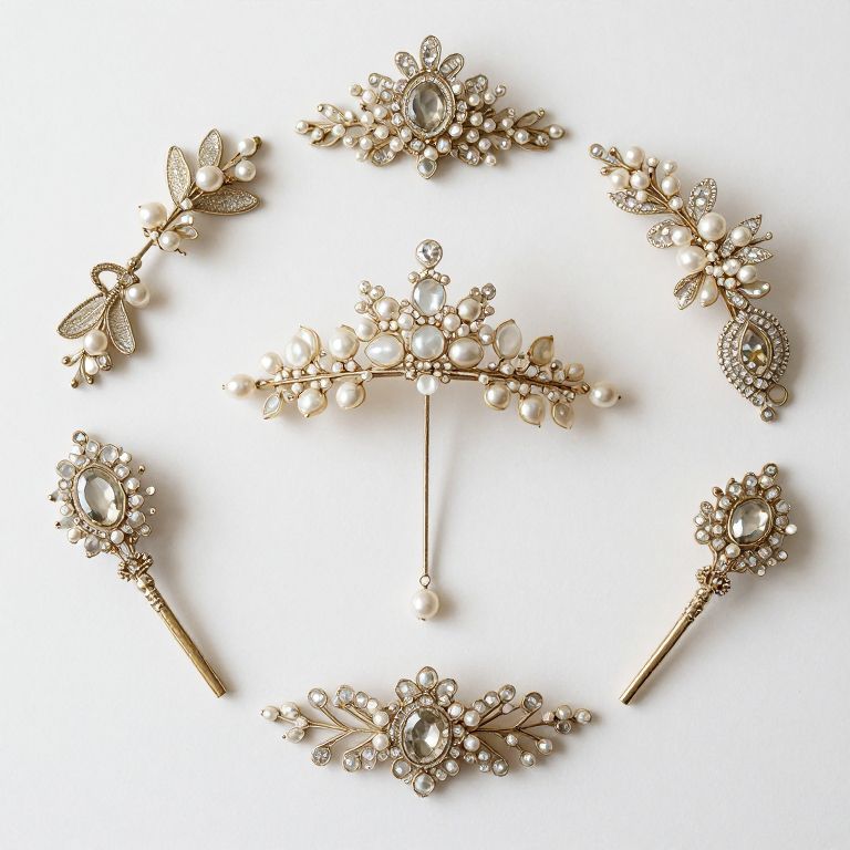 Photograph of six ornate, vintage-style jewelry pieces featuring pearls, gemstones, and intricate filigree, arranged in a circular pattern on a