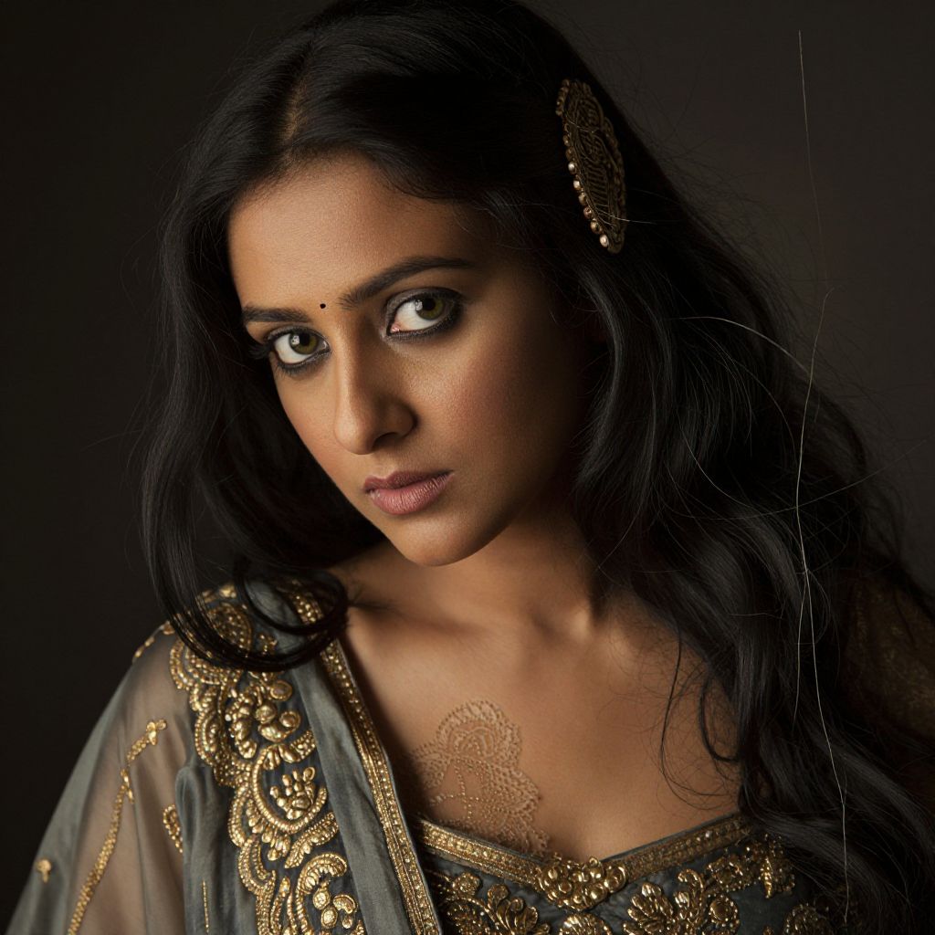 Photograph of a serious Indian woman with long black hair, wearing an intricately embroidered gold and grey traditional outfit, against a dark background.