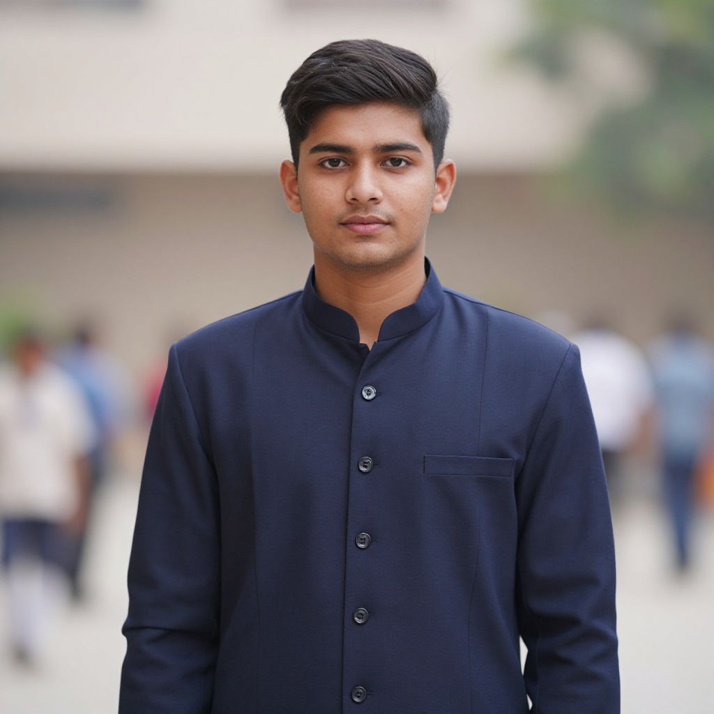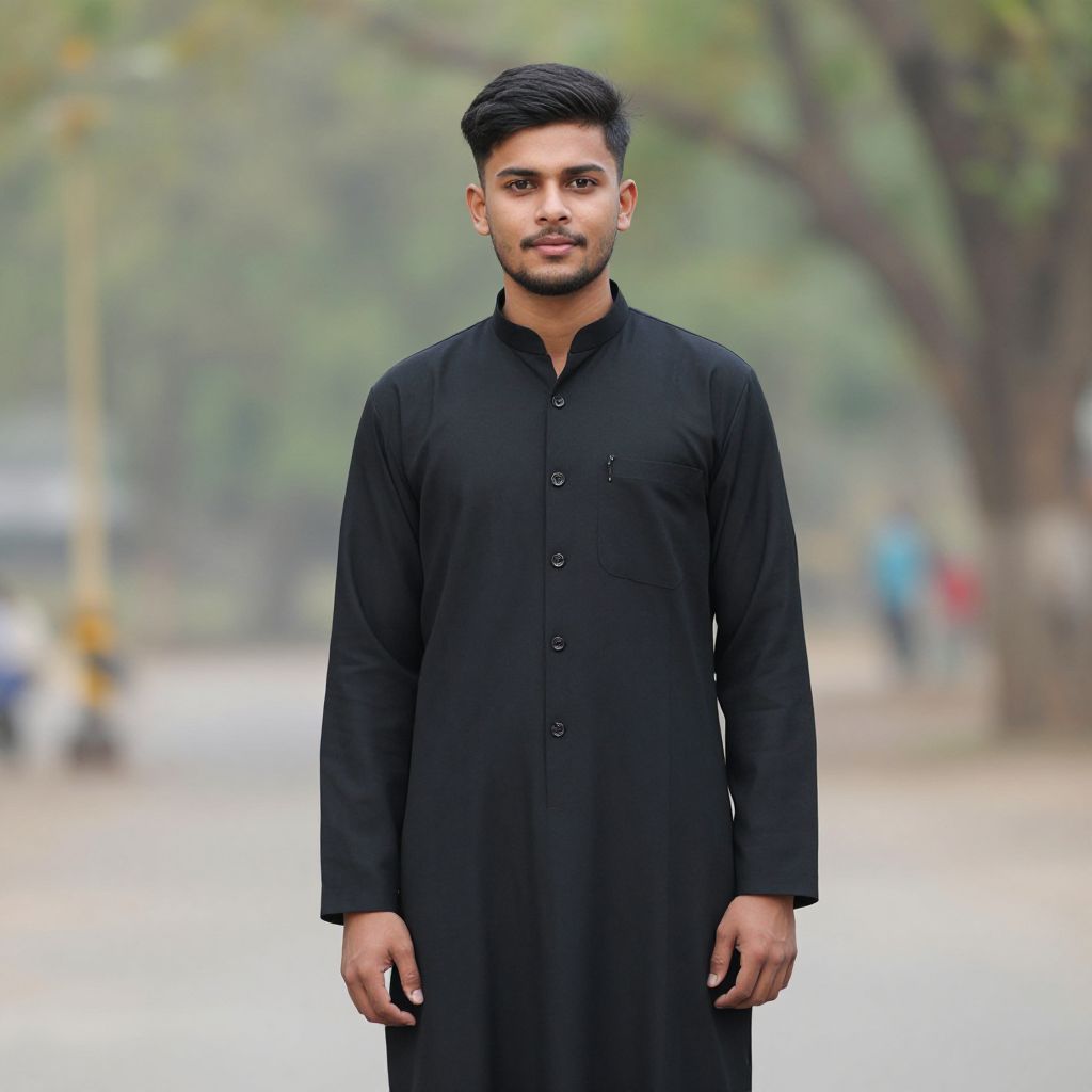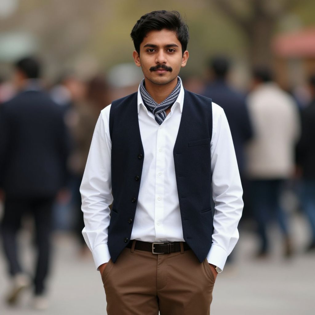 Photograph of a young South Asian man with dark hair and beard, wearing a black shirt, white pants, and black belt, pointing at a smart