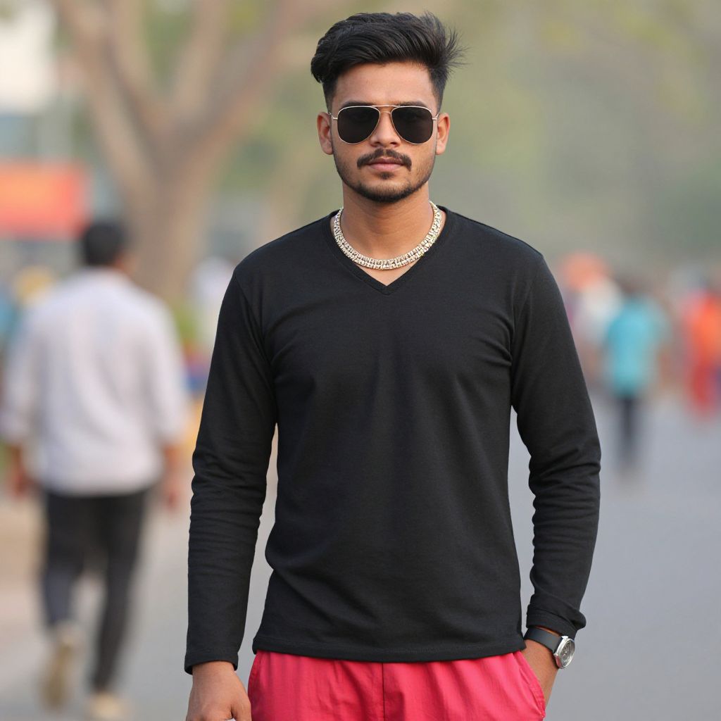 "cotton clothes man, 1boy, male focus, solo, watch, wristwatch, shirt, facial hair, pants, belt, flower, outdoors, brown hair, collared shirt, white pants, standing, blurry, blurry background, looking at viewer, hands in pockets, black shirt, realistic Realistic photo of casual sexy person with pretty face"