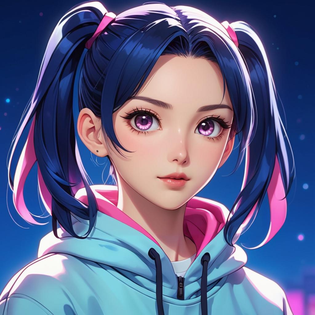 A detailed anime portrait of a young woman with dark blue hair tied in a ponytail and vibrant pink eyes, soft lighting illuminating her face, wearing a light-colored hoodie, gentle expression, night background with deep blue hues, cel shading style with sharp highlights and smooth shadows, blue and pink color tones