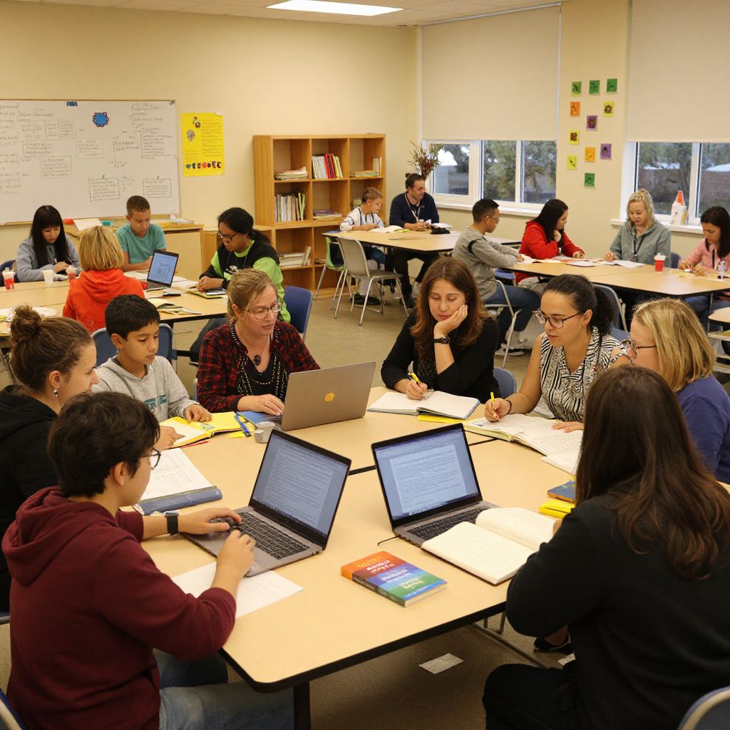 Photograph of a classroom with diverse group of students, mostly teenagers, sitting at tables using laptops, engaged in a collaborative activity. Bright, well-l