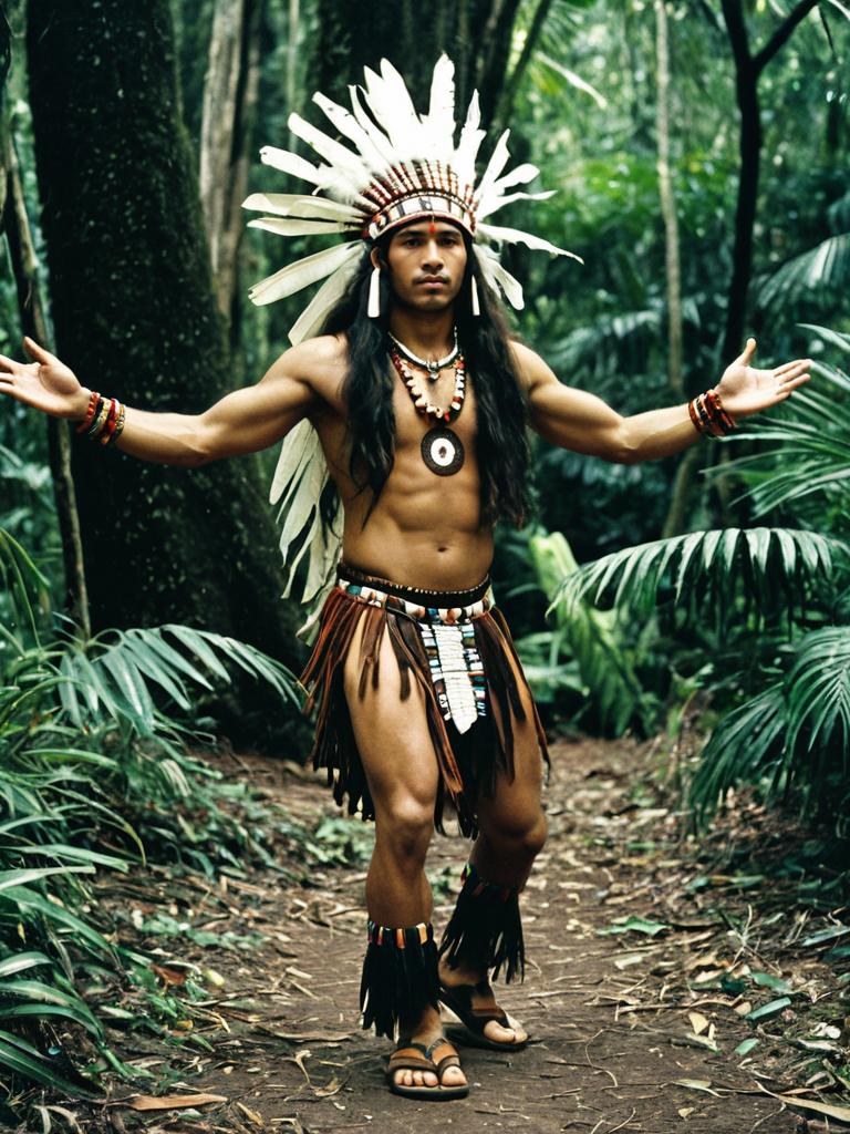A topless man wearing a traditional tribal jungle dance costume stands outdoors in a forest setting. He is adorned with a large feather headdress, beaded necklace, bracelets, and a fringed skirt with decorative beads. The man has long hair and is wearing sandals and leg jewelry, surrounded by lush green foliage and trees.