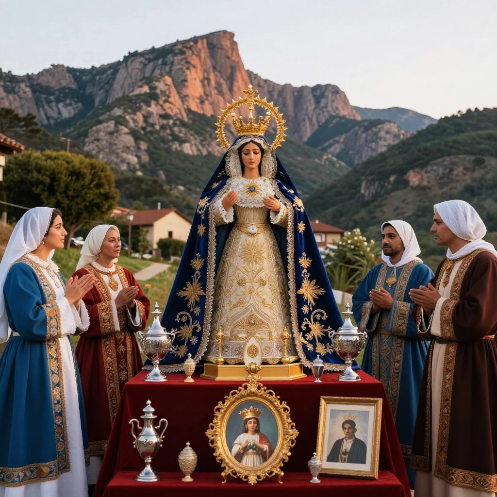 Montserrat Virgen surrounded by pilgrims in a mystical Catalan mountain setting, vibrant natural colors, sunrise lighting, intricate robes and traditional religious artifacts.