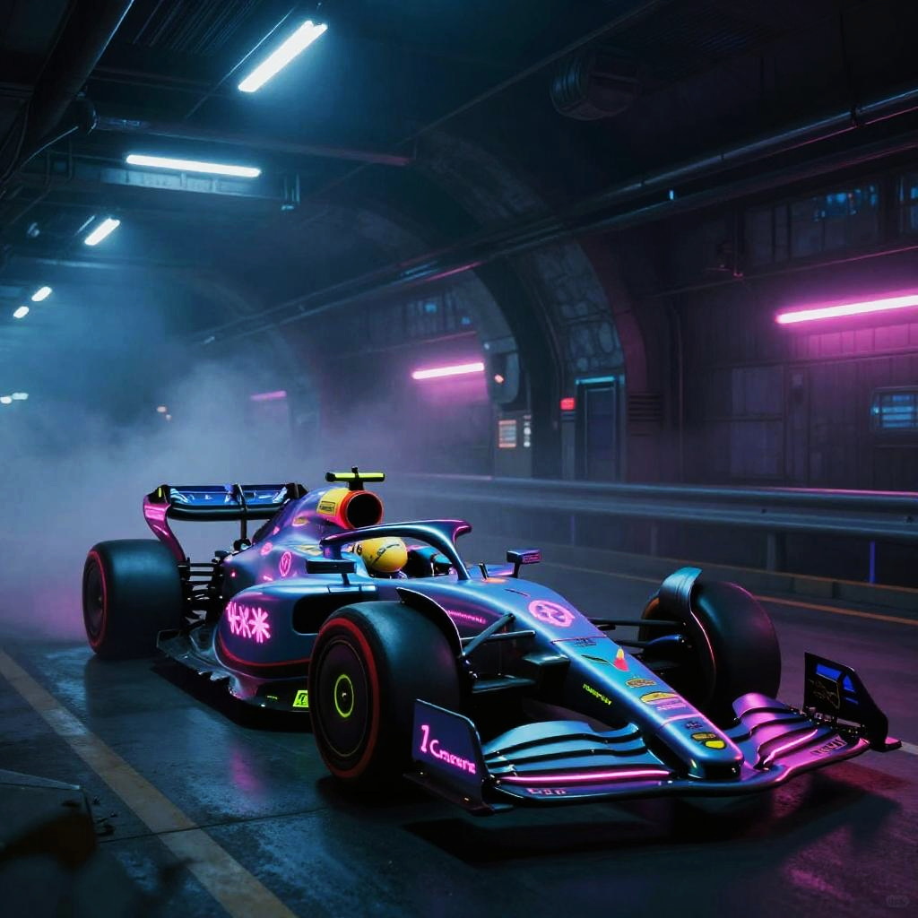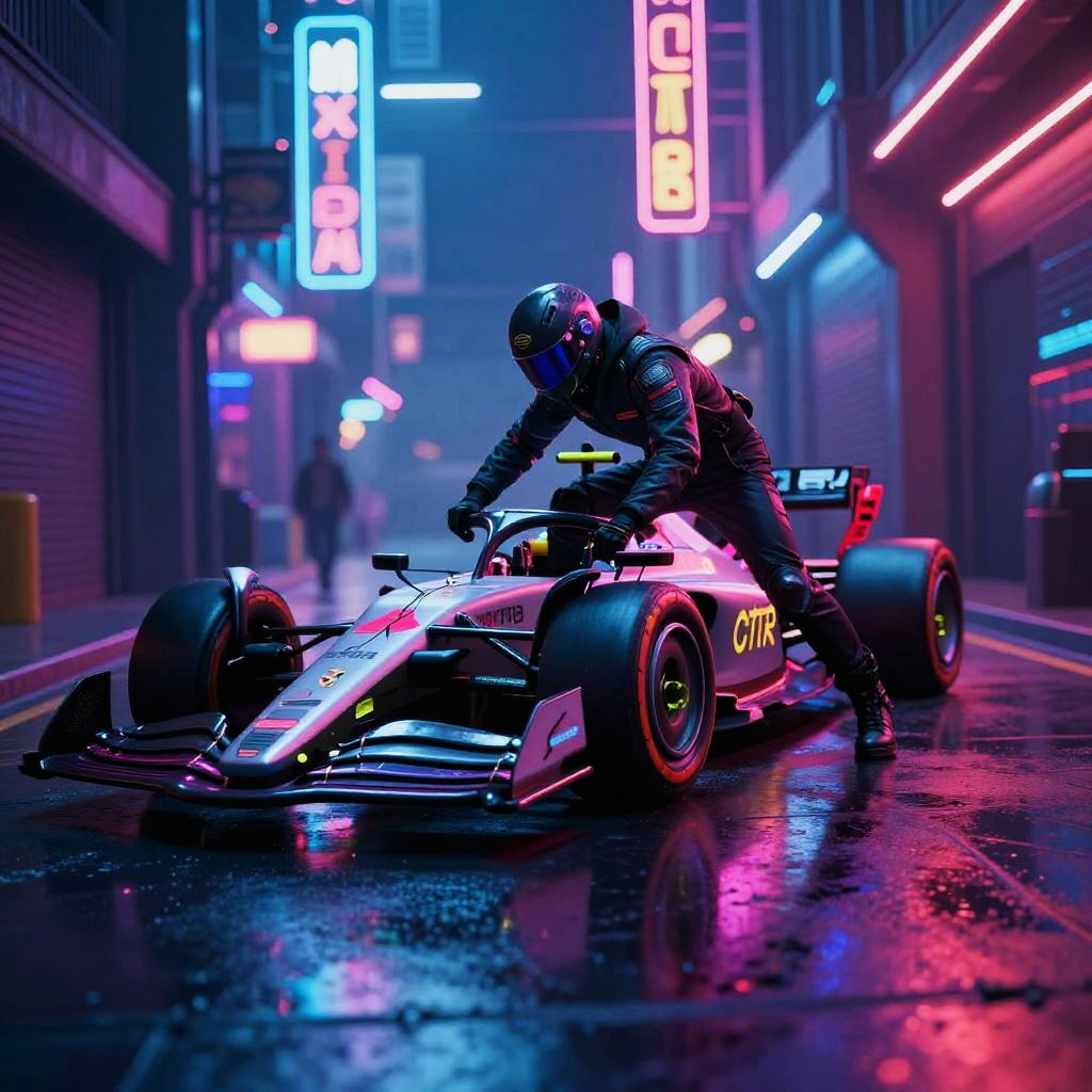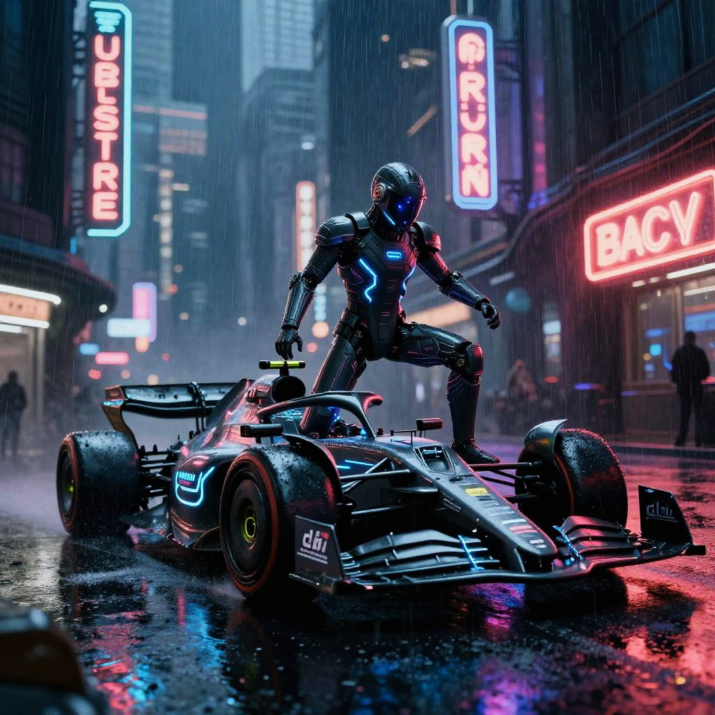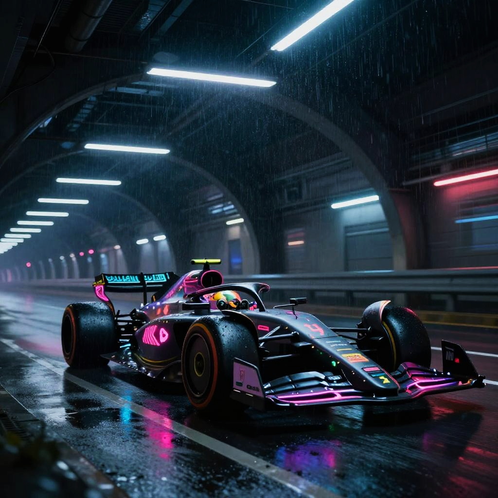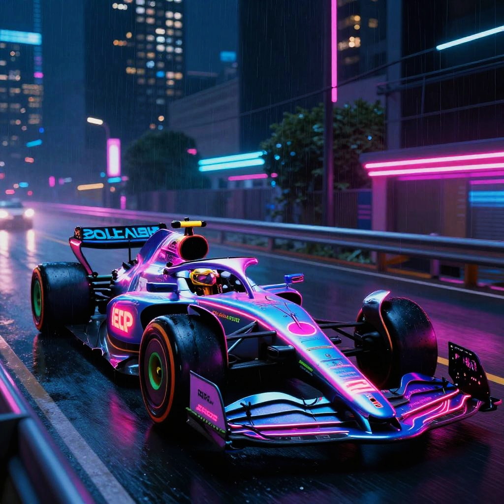 Product neon noir photo of a sci-fi formula 1 light drizzle at night on a city highway, cyberpunk, neon lights:1.4, masterpiece, best quality, (intricate details), (****), eldritch, volumetric lighting, unique pose, dynamic pose, dutch angle, 35mm, anamorphic, lightroom, cinematography, film grain, HDR10, 8k hdr, Steve McCurry, ((cinematic)), RAW, color graded portra 400 film, remarkable color, raytracing, subsurface scattering