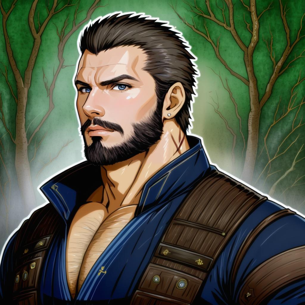 Adventurer (ff14), final fantasy, 1boy, mature male, beard stubble, mustache stubble, blue eyes, thick eyebrows, scar across eye, short hair, brown hair, black hair, medium hair, hair slicked back, hyur, stubble, bara, muscular male, pectoral cleavage, large pectorals, by artist sankuro (agoitei), anime