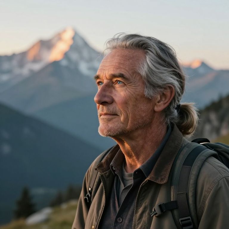 Craft a captivating portrait photo with a seasoned traveler as its subject, their retro face adorned with wistful blue eyes and graying hair tied back in a low ponytail. Illuminate them with soft golden light from an unseen source, capturing the essence of a life filled with adventures. As they gaze off into the distance, their expression conveys contemplation about their next journey. Set against a majestic mountain backdrop where towering peaks are bathed in early morning light, this portrait seamlessly merges fine art and landscape photography to evoke feelings of wanderlust and introspection. It showcases not only the subject's physical beauty but also the profound depth of their life experiences.