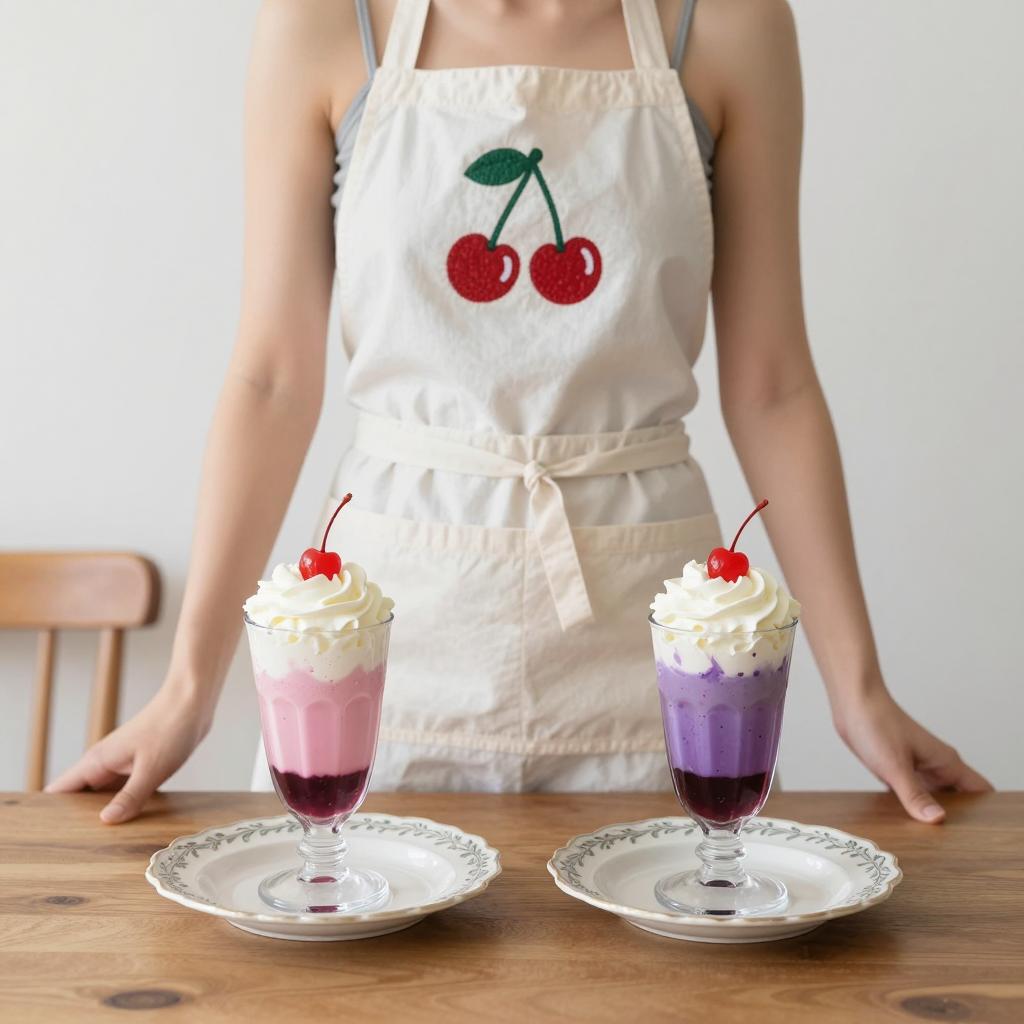 Young woman wearing a white apron with a cherry pattern stands behind two tall glasses on ornate plates. The glasses contain layered pink and purple syrup milkshakes topped with whipped cream and garnished with red cherries. The scene is set on a wooden table with a light wood chair in the background, focusing from neck to waist.