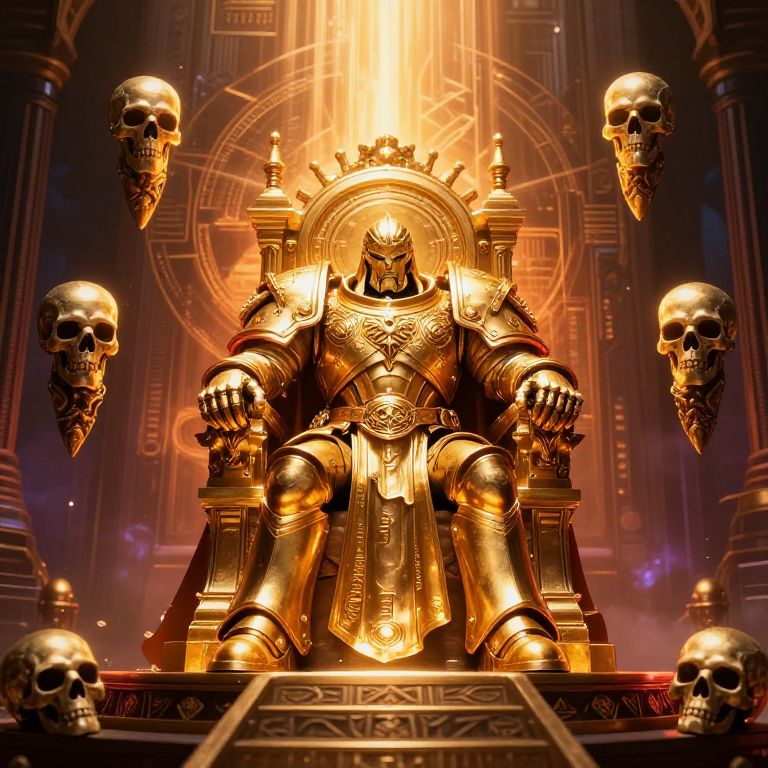Digital art of a golden armored figure on a radiant throne, surrounded by floating skulls, in a dimly lit, sci-fi temple.