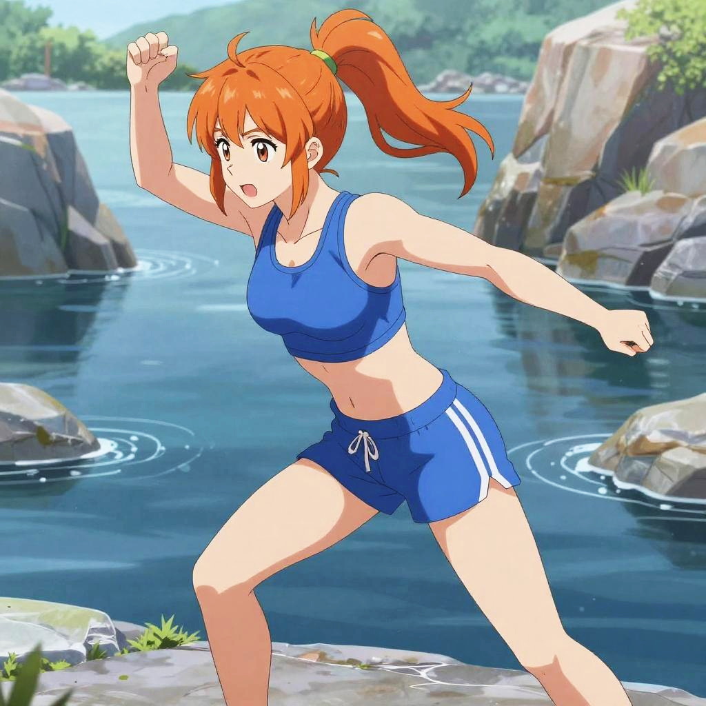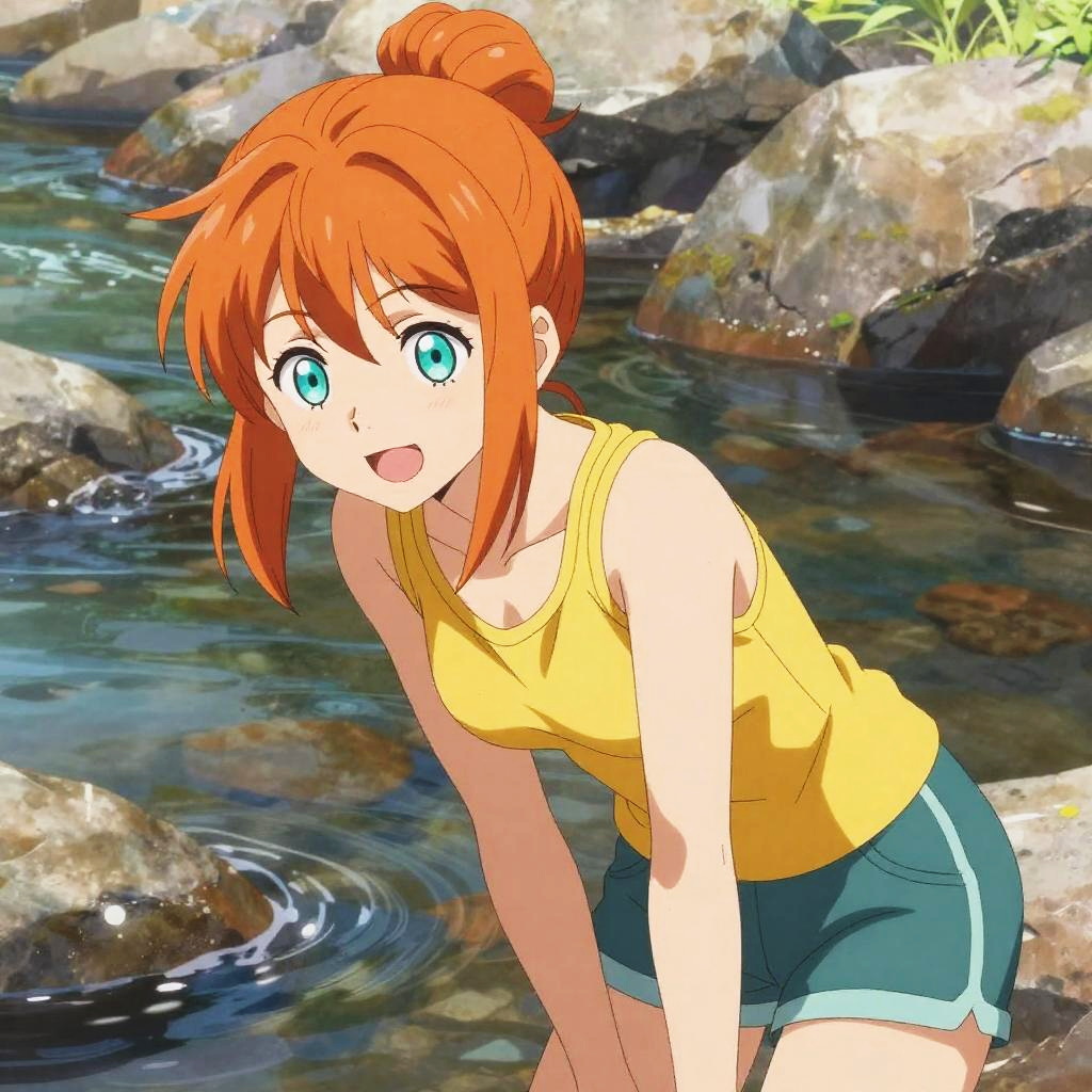An anime girl with vibrant orange hair in a bun and bright teal eyes, wearing a yellow tank top and dark teal shorts, leaning forward with a playful smile, background of a sunny rocky river scene with water reflecting light, soft natural lighting, detailed shading, expressive and lively facial expression, warm orange and cool teal color contrast
