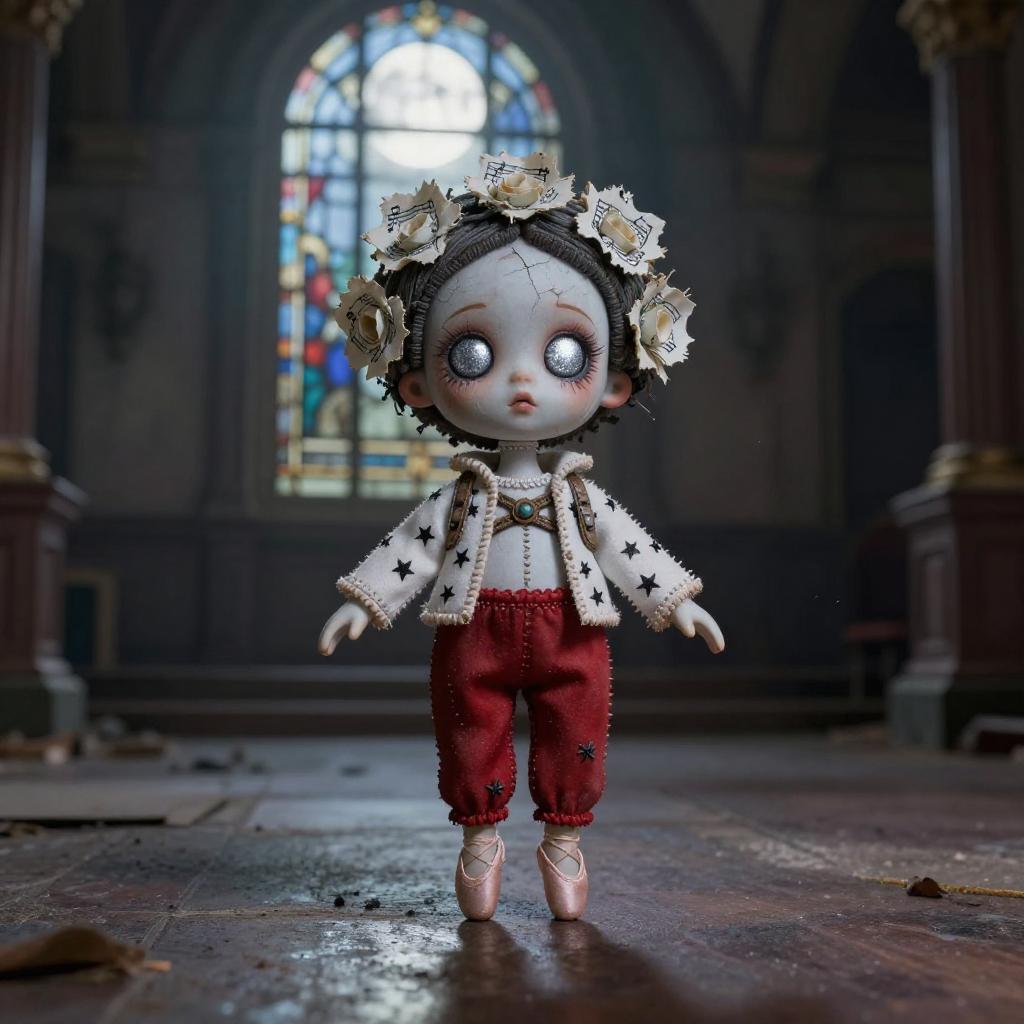 Petite ghostly ballerina doll with cracked pale porcelain skin, shining silver eyes, and tattered sheet music flowers in her hair wearing a white jacket with black star patterns, red pants, and a detailed harness, standing confidently at the center of abandoned grand ballroom dimly illuminated by moonlight filtering through stained glass. Adorable yet eerie mood, centered full body, shallow depth of field, soft vignette, cinematic shadows, ultra-detailed materials, fine stitching, patina, subtle film grain, mist or dust motes, reflective surfaces, bokeh. Render as horror stop-motion vintage aesthetic with crisp face focus, volumetric light, depth haze, high contrast, tasteful color grade, storytelling environmental details, SDXL high quality.