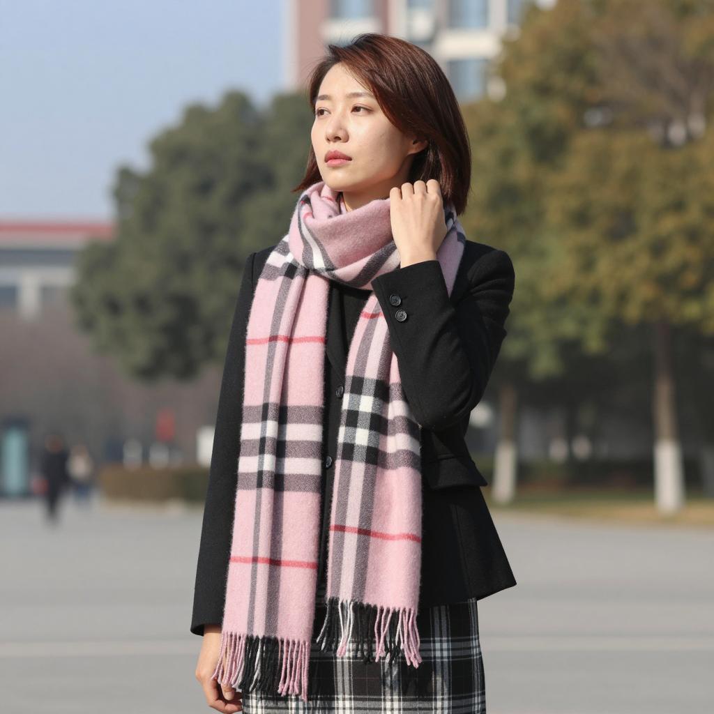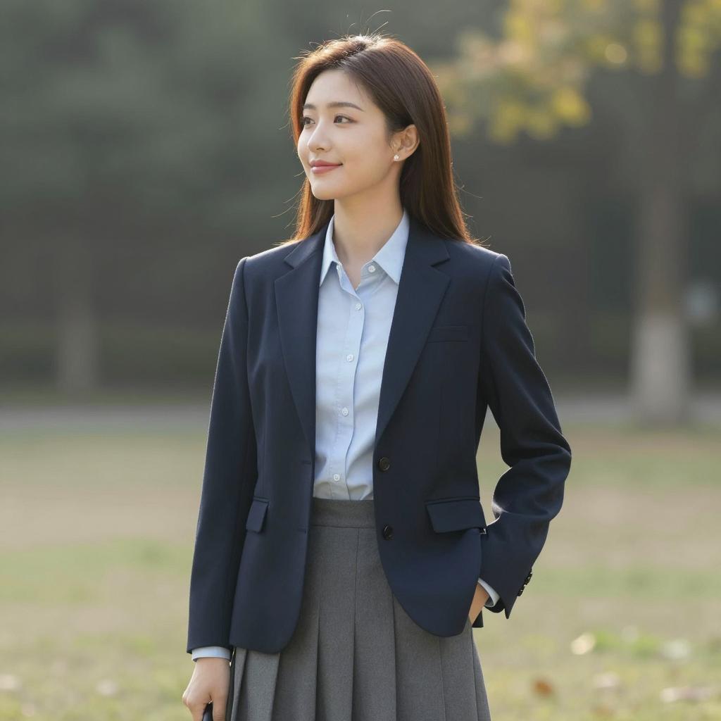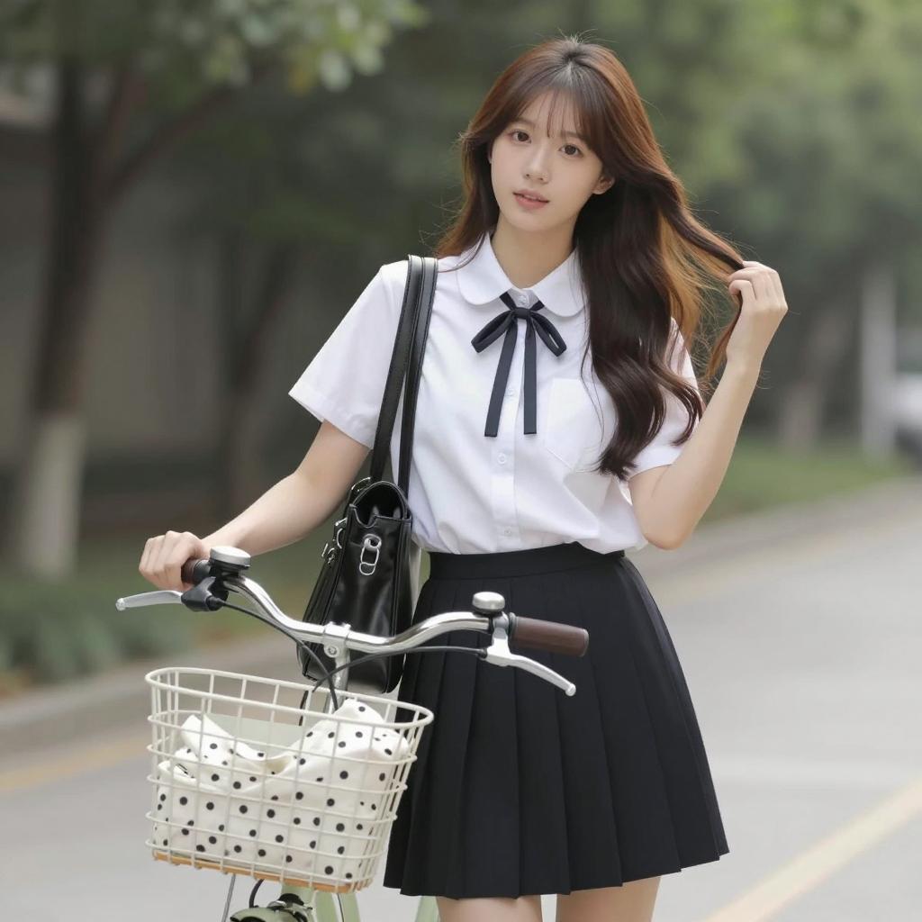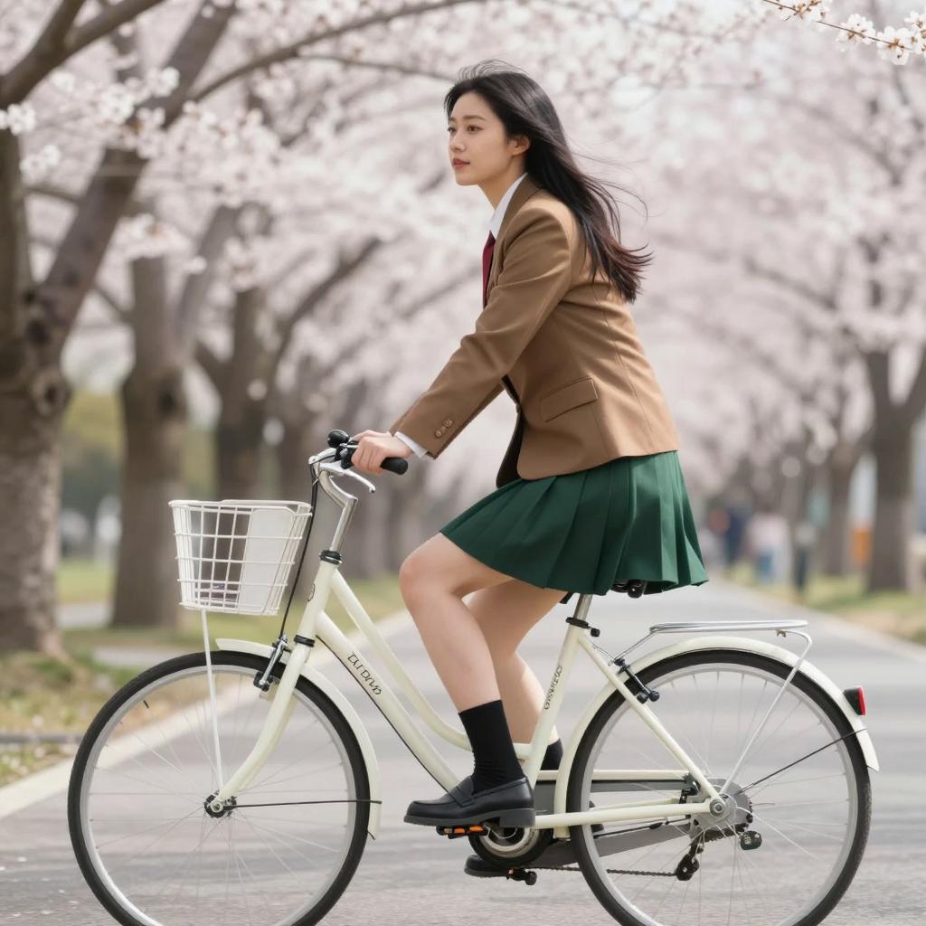 Asian woman with long brown hair, wearing a navy blazer, plaid scarf, black skirt, white socks, sitting on a bicycle. Large black backpack on her back. Right hand touching her face, left hand on the bicycle handle. Green blurred background.