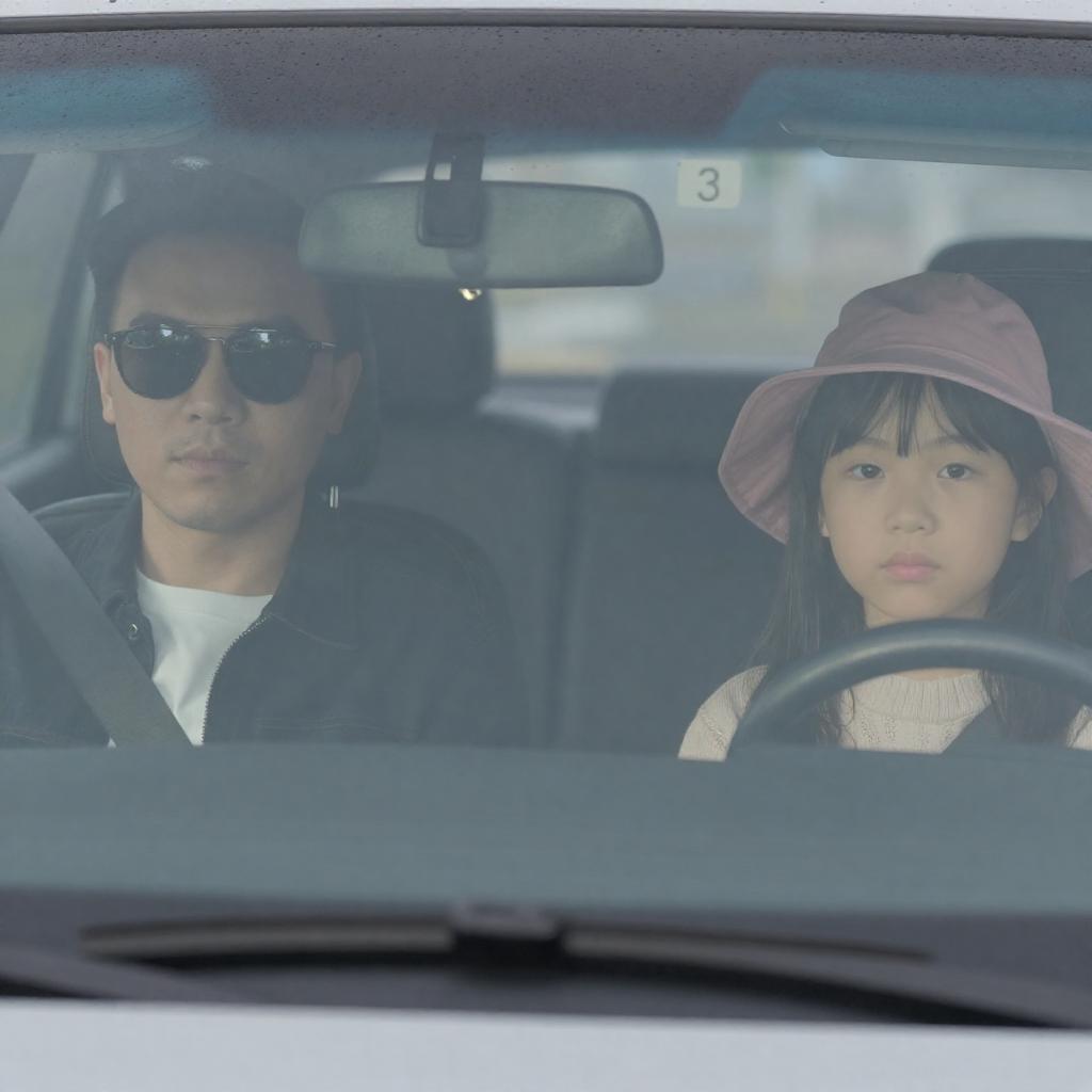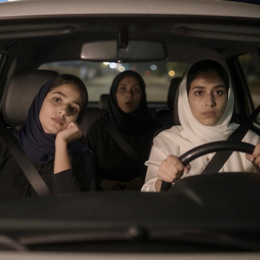 View through the windshield of a car with a visible crack on the glass. Inside, a heavyset man wearing a green jacket is seated in the passenger seat, mouth open as if yelling. A woman wearing a beige headscarf and gray clothing is focused on driving, holding the steering wheel. Sunlight casts shadows inside the vehicle with a blurred blue tarp visible in the background.