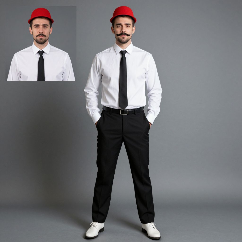 Theme party guy costume, 1boy, male focus, necktie, facial hair, hat, full body, pants, coat, mustache, hands in pockets, standing, white shirt, white footwear, shoes, shirt, belt, vest, looking at viewer, long sleeves, reference inset, beard, collared shirt, black pants, grey background, red headwear