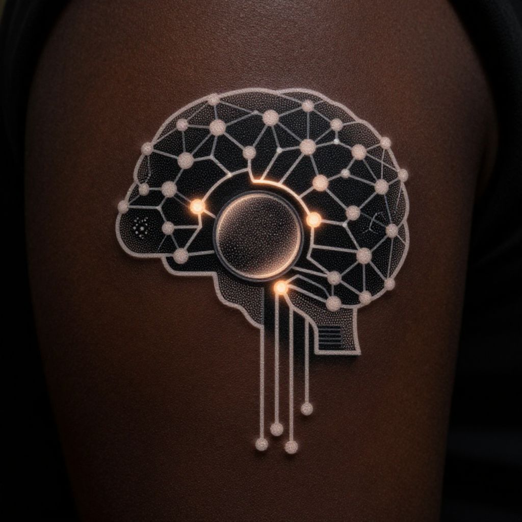 Ai designed tattoo showcasing a minimalist yet complex representation of artificial intelligence through interconnected nodes and glowing lines, set against dark skin for sharp contrast, emphasizing technological elegance with fine dot work and clean vector shapes