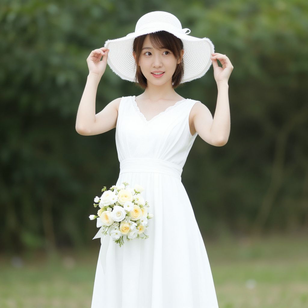 Photograph of an Asian woman with fair skin and short black hair, wearing a white, sleeveless, knee-length dress and a wide-brimmed white hat. She holds the hat's brim with both hands, smiling slightly. She carries a bouquet of white and yellow flowers at her hip. The background is a blurred, green outdoor setting with trees and grass. The bright white dress and hat contrast with the dark green background, making her the focal point. The image has a soft, slightly overexposed lighting effect.