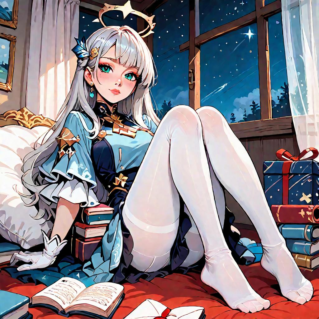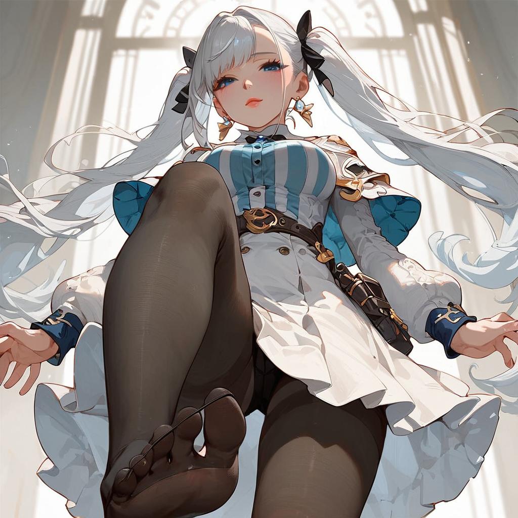 Score_9, score_8_up, score_7_up, source_anime, 1girl, feet, from below, pov, standing on one leg, green eyes, white hair, long hair, twintails, earrings, white capelet, striped shirt, long sleeves, belt, white skirt, black pantyhose