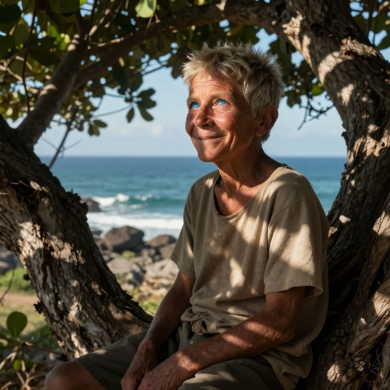 Photograph of an elderly woman with short, spiky gray hair and bright blue eyes, sitting under a tree with textured bark. She wears a beige, short-sleeved, slightly worn t-shirt and dark shorts. Sunlight filters through the leaves, casting dappled shadows on her smiling face. The background reveals a blurred, scenic ocean view with white waves crashing onto a rocky shore. The image has a warm, natural light and a slightly rustic, serene atmosphere.