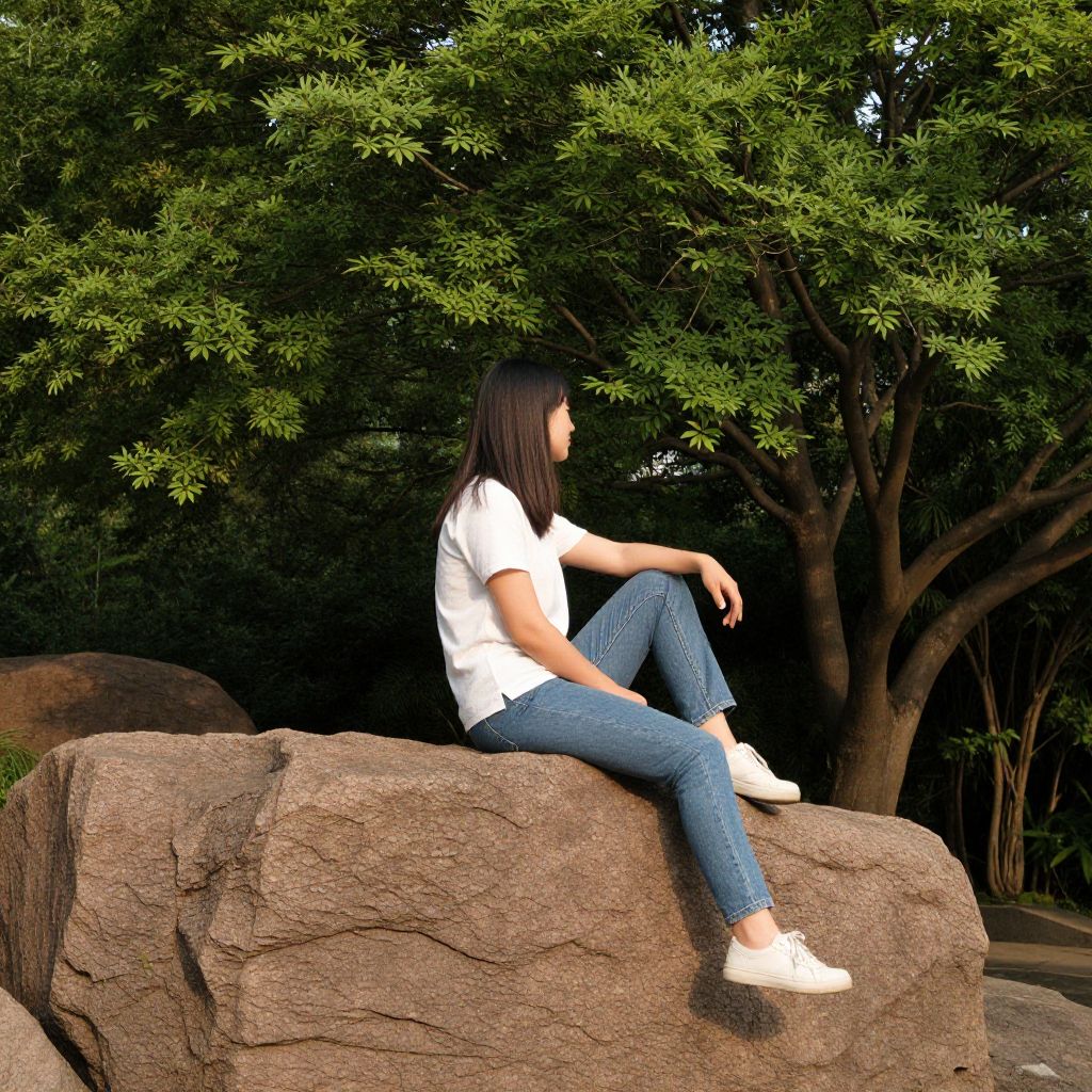 Photograph of a young woman with straight black hair, wearing a white short-sleeved t-shirt and blue jeans, sitting on a large, textured brown rock in a forested area. She is positioned in profile, with her left arm resting on her knee and her right arm hanging down. She wears white sneakers. The background features dense, green-leaved trees and more rocks. The lighting is natural, highlighting the woman's relaxed pose and the rock's textured surface. The overall scene conveys a peaceful, outdoor setting.