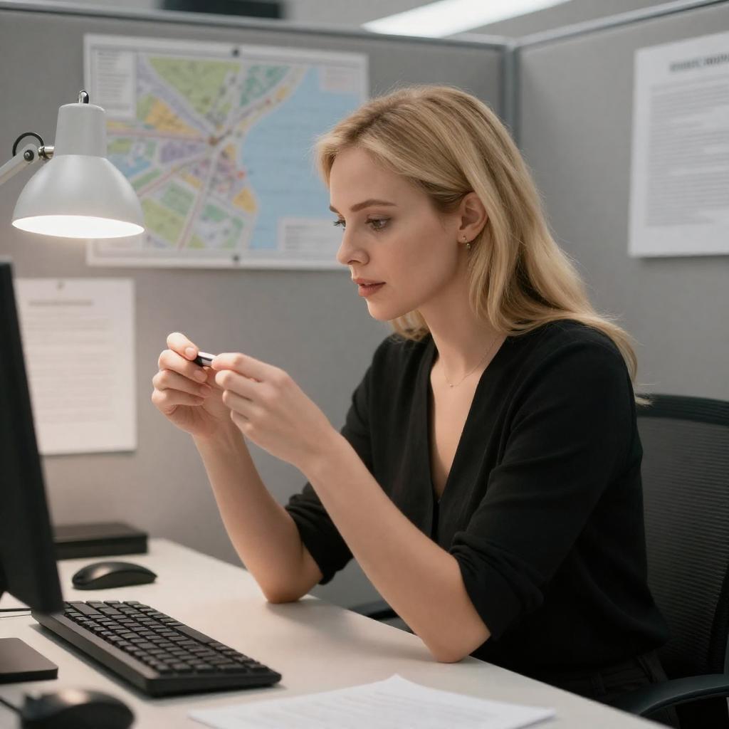 Photograph of a blonde woman with short hair, wearing a purple floral blouse, sitting at a cluttered desk. She rests her chin on her hand, looking to the side. The desk has a computer monitor, papers, a lamp, and a cushion. Background includes dark blue walls with pinned photos and a wooden shelf.