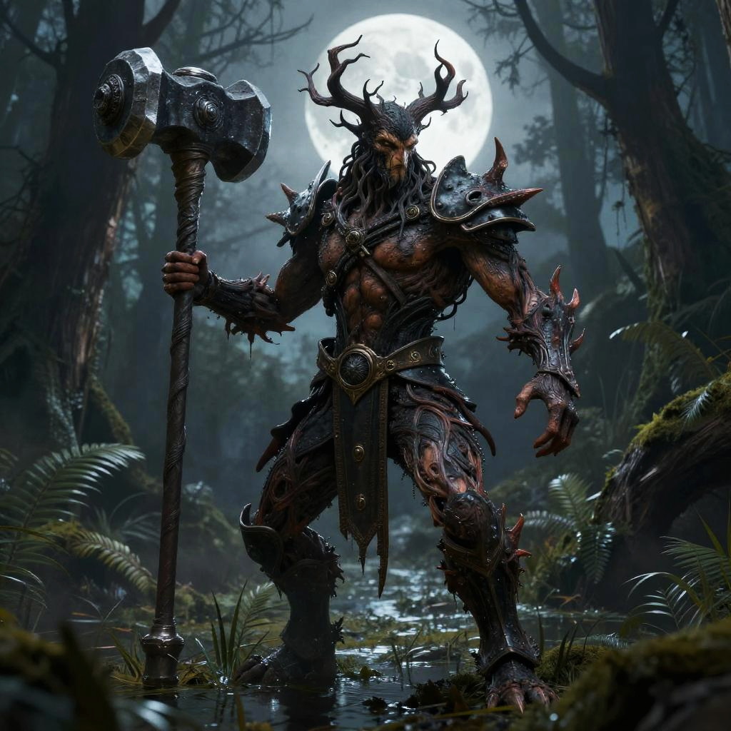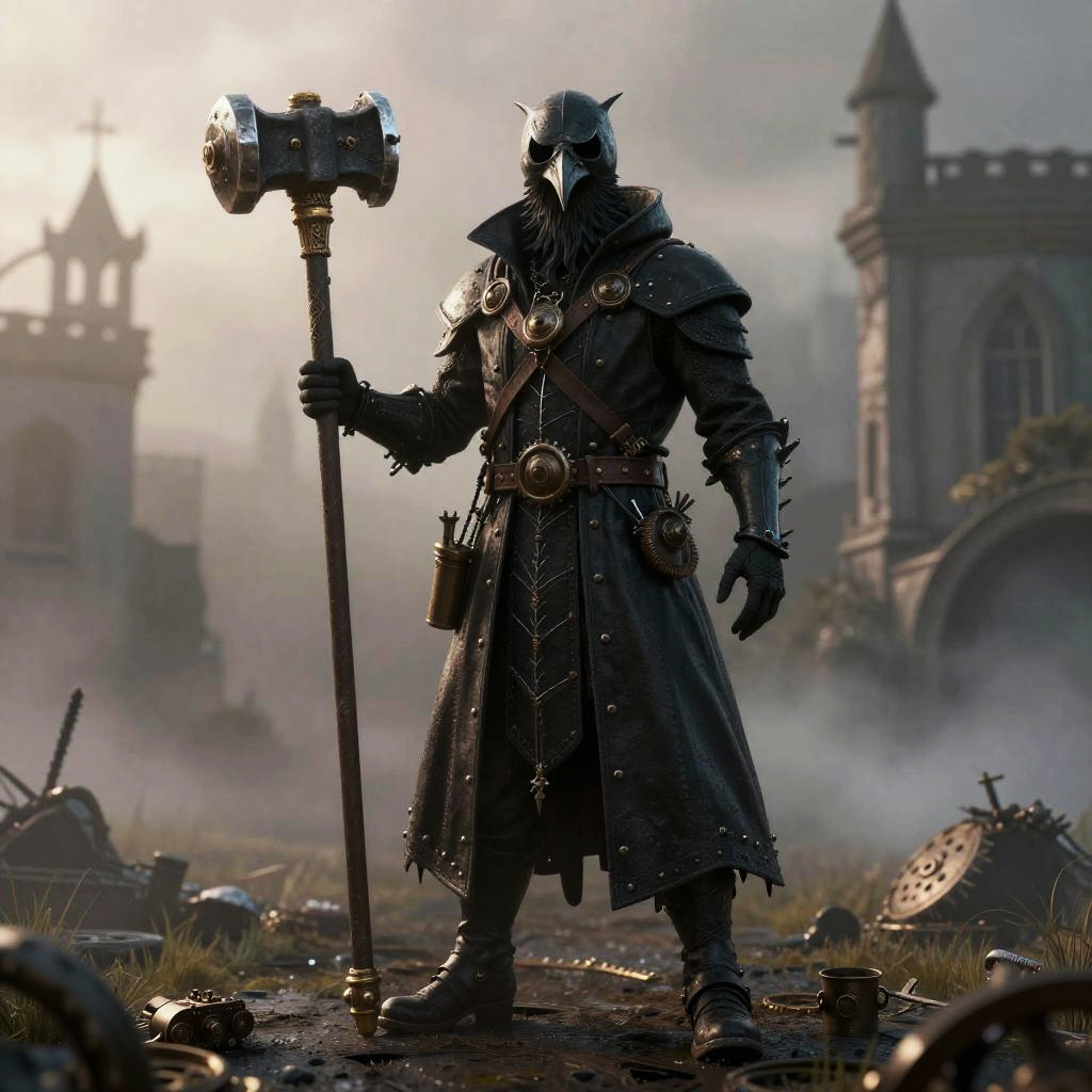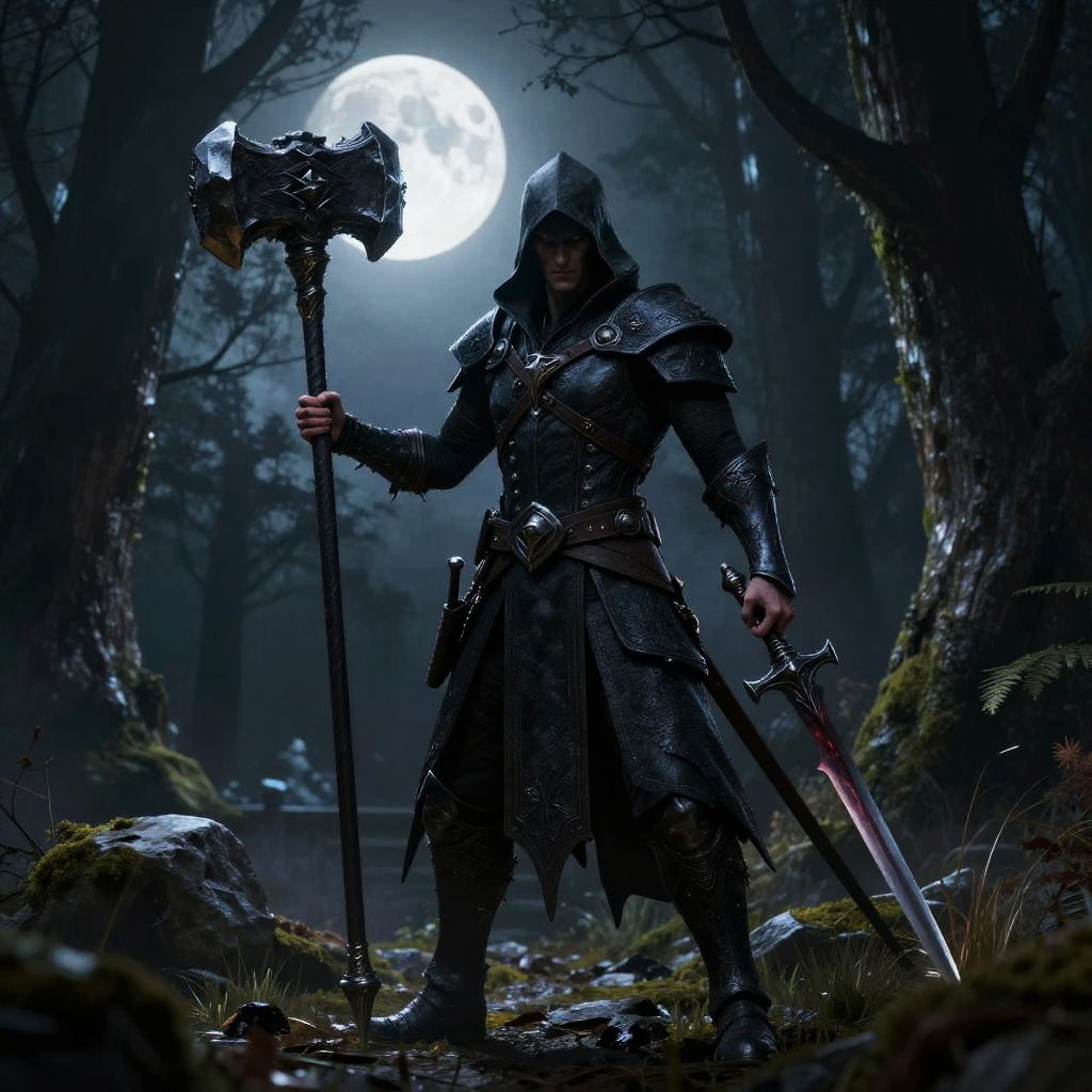 Full body concept of twilight gryphon rider clad in enchanted armor, holding a giant hammer, dark fantasy, snowy nighttime setting, cinematic lighting, volumetric, octane render, 8k resolution