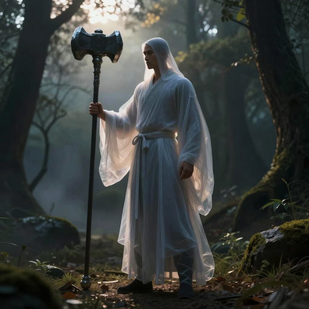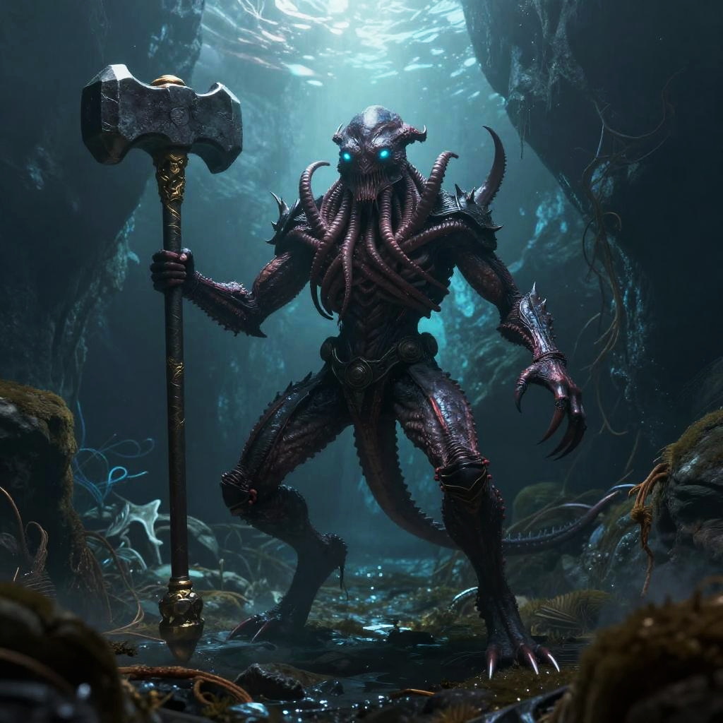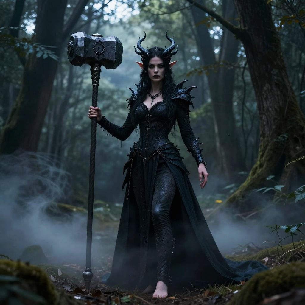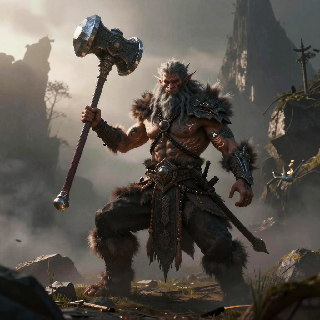 Full body concept of twilight gryphon rider clad in enchanted armor, holding a giant hammer, dark fantasy, snowy nighttime setting, cinematic lighting, volumetric, octane render, 8k resolution