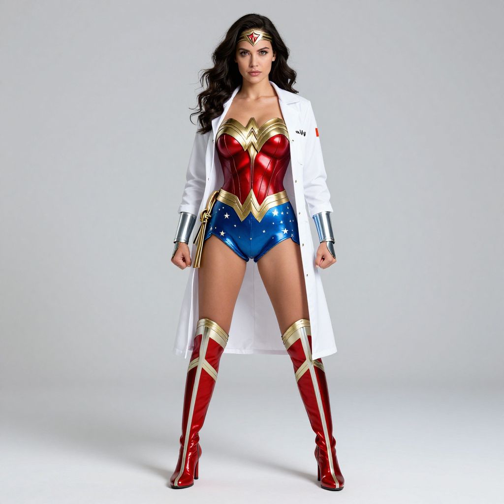 Dynamic Wonder Woman stands confidently in her iconic costume, featuring a flowing white lab coat over her classic red and gold bodysuit, blue star-adorned shorts, and red high-heeled boots, embodying both scientific intellect and superhero prowess.