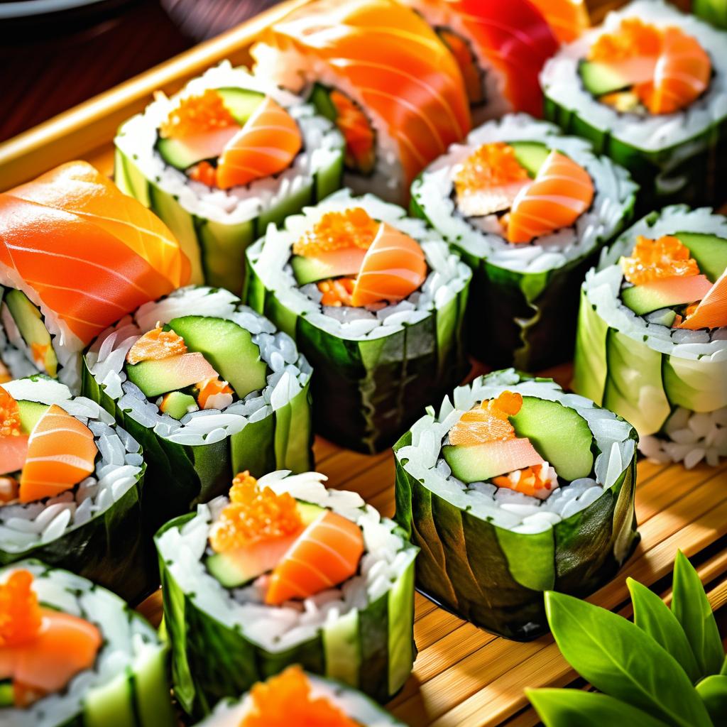 Macro gourmet photography of refreshing sushi rolls in HDR, professional quality with vibrant details.