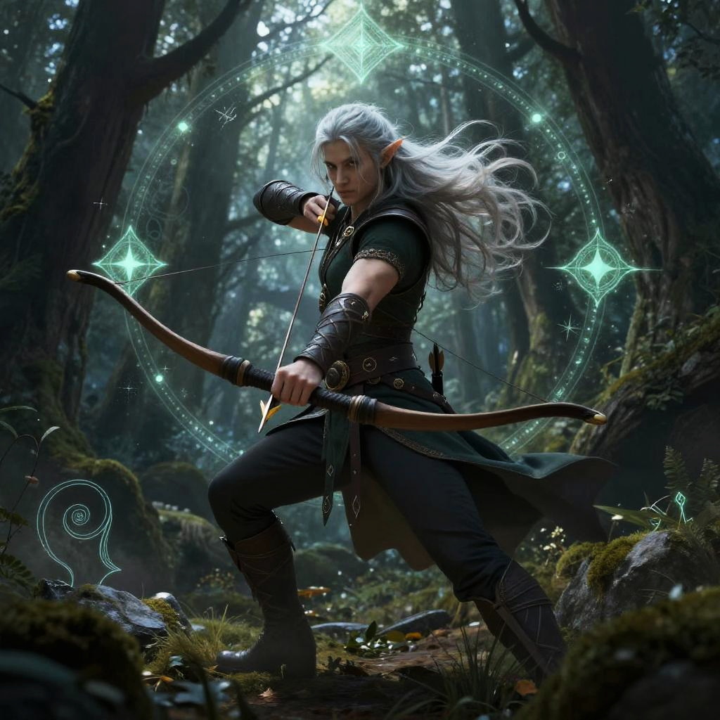 Elven rogue escaping through ancient ruins lit by flickering torchlight, agile and stealthy with curved daggers, emerald eyes scanning for danger, detailed and dramatic fantasy style