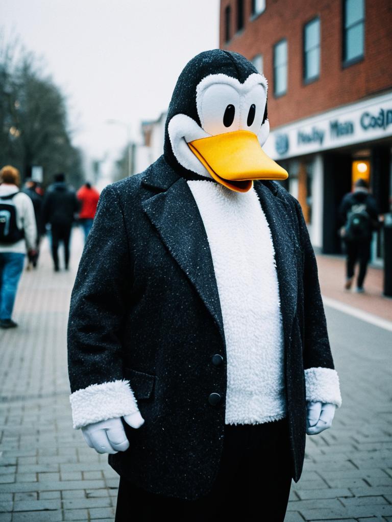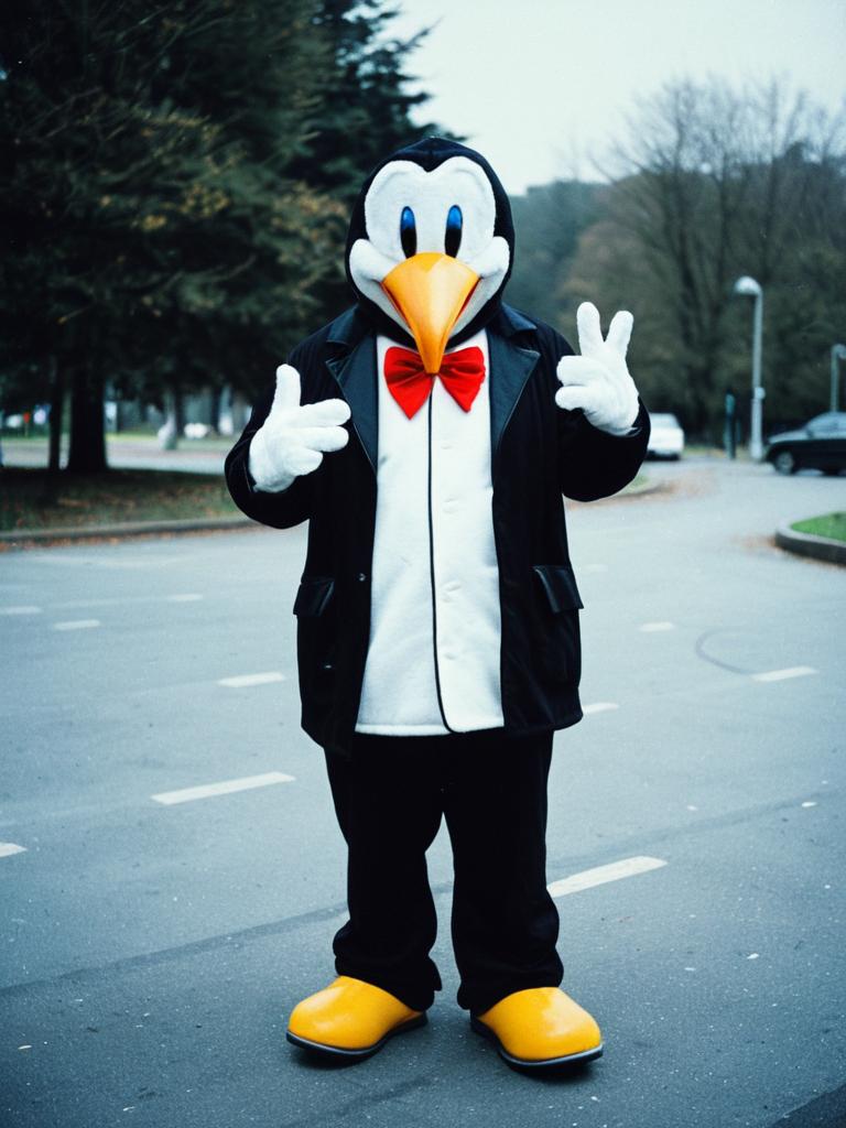 A person dressed in a detailed Chilly Willy cartoon character costume with a large yellow beak, black and white fur suit, and a black coat with white cuffs. The cosplay is set outdoors on a city street with pedestrians and buildings in the background, suggesting an urban environment.