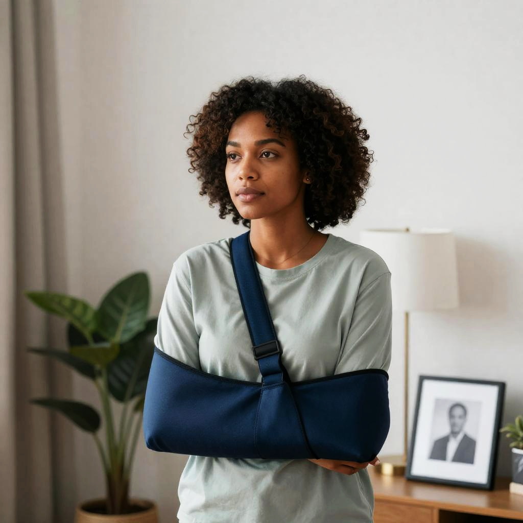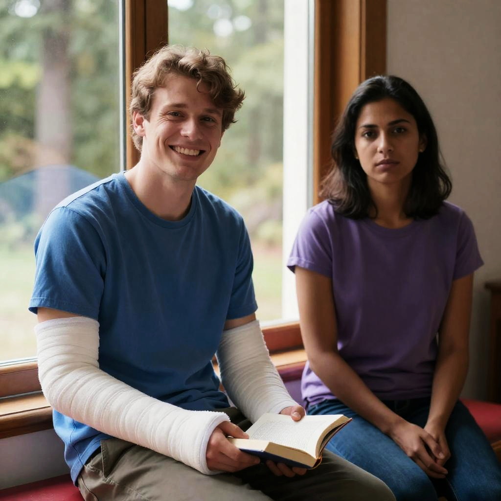 Man with short brown hair kneeling on black asphalt road, right arm with red bruise, wearing light blue shirt and beige pants, crutches lying in front. Desert-like background with dry, rocky terrain. Man's head down, hands clasped.