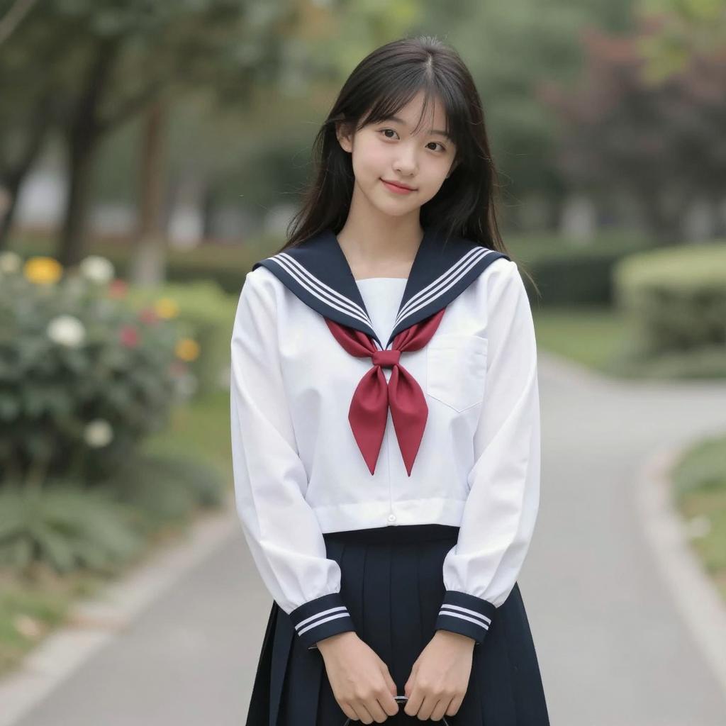 Asian woman with long black hair wearing a navy blue sailor school uniform. Standing outdoors, arms behind her back. Trees with pink blossoms in the background. Light brown dirt ground. Soft light. Slightly tilted head, neutral expression. One person. Photographic style.