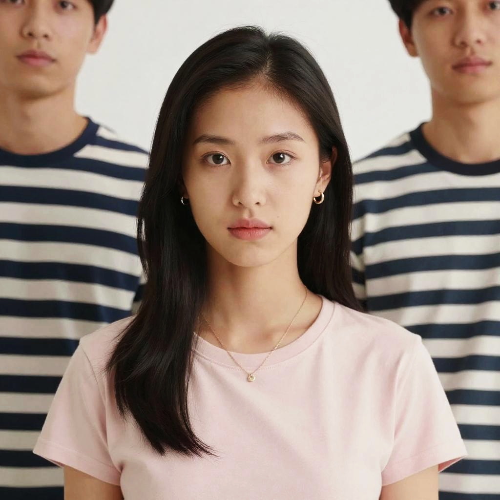 Shirt, multiple girls, realistic, jewelry, striped shirt, outdoors, multiple boys, striped clothes, grass, tree, smile, white shirt, necklace, sitting, long hair, grin, black hair, photorealistic, day, blue shirt, 5girls, shorts, black shirt, brown hair, 4boys