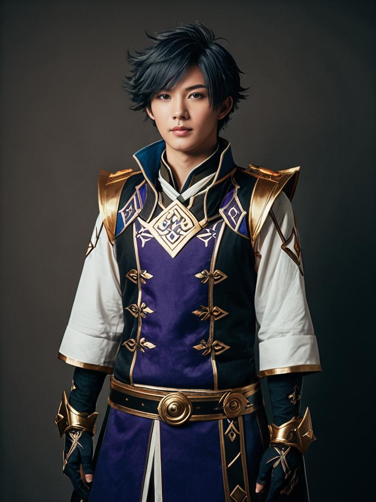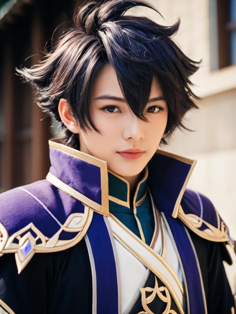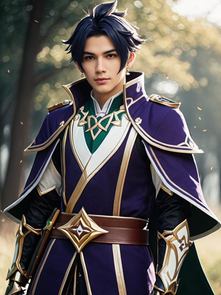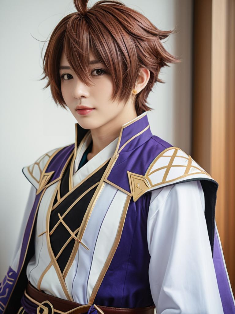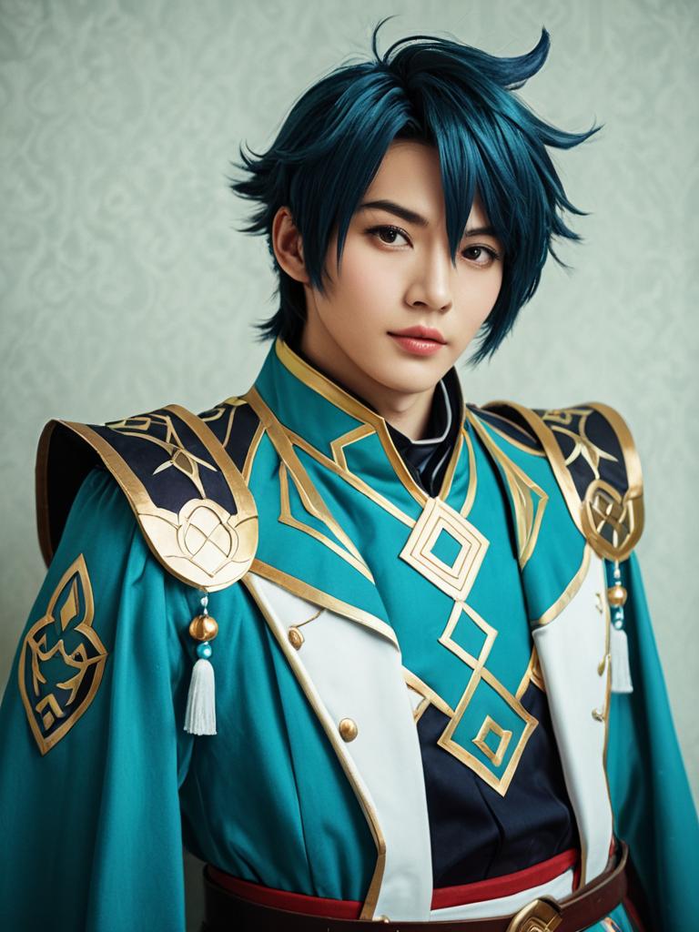 Man in Childe Genshin Outfit, close-up detailed headshot with styled hair --sref 1388