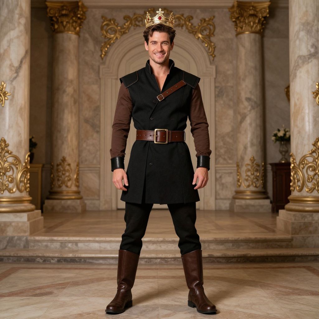 A handsome man with a confident smirk, standing in a grand room featuring ornate pillars and a decorative crown resting on his head. He is wearing a striking black and brown outfit accented with a prominent brown belt and matching brown boots.