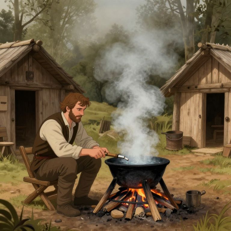 A digital illustration depicts a bearded man with brown hair, wearing a white shirt and brown vest, sitting on a wooden chair by a small, circular campfire. White smoke rises from the fire, which is built on a simple tripod stand. The man holds a metal cup in his right hand. Two rustic wooden cabins with pitched roofs and dark doorways are in the background, surrounded by tall, green trees. A metal bucket and pot are placed on the ground to the right of the fire. The scene exudes a historical, pioneer-like atmosphere.