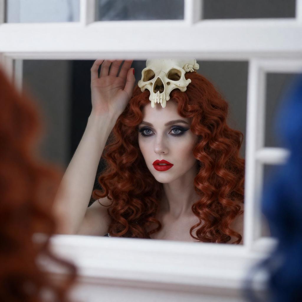 Photograph of a pale woman with intense dark eye makeup and bright red lipstick, peering through a white, ornate window frame. She has voluminous curly red hair and a white bone-shaped headpiece. Foreground has blurred red and blue colors. One arm is raised, gripping the window frame. Background is dark and indistinct.