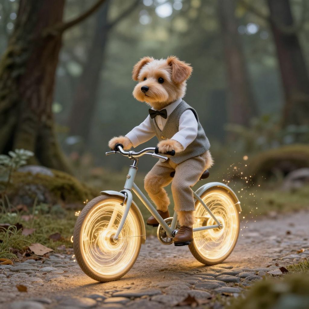 A whimsical canine figure clad in human attire gracefully pedals a bicycle whose wheels radiate ethereal spirals of golden light, casting an otherworldly glow upon a cobblestone path in a serene, enchanted forest.