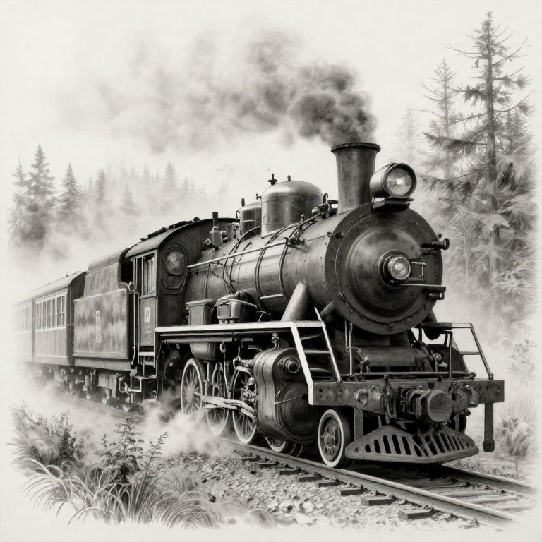 Train images drawing depicting a vintage steam locomotive chugging through a misty forest landscape at dawn, intricate pencil sketch style with high detail on engine parts and surrounding nature, soft shading and realistic textures.
