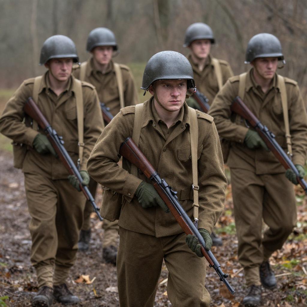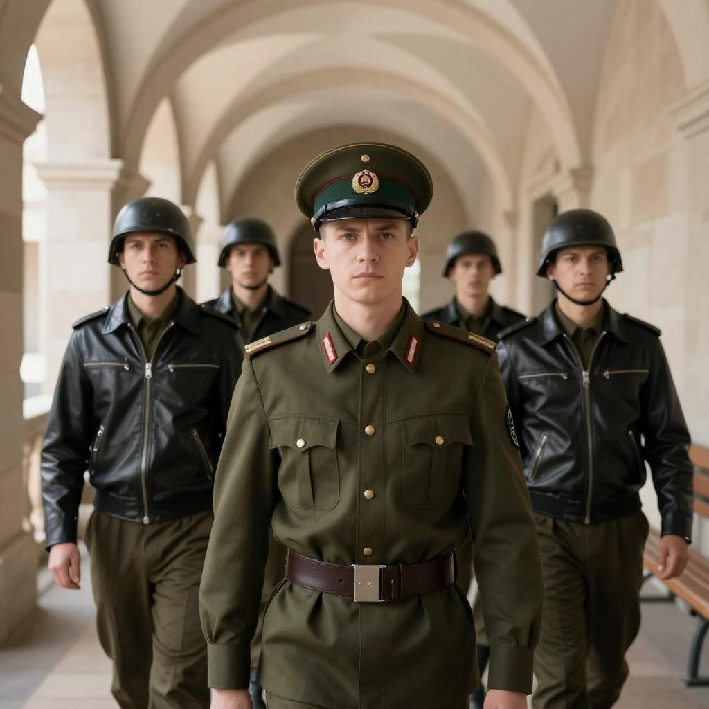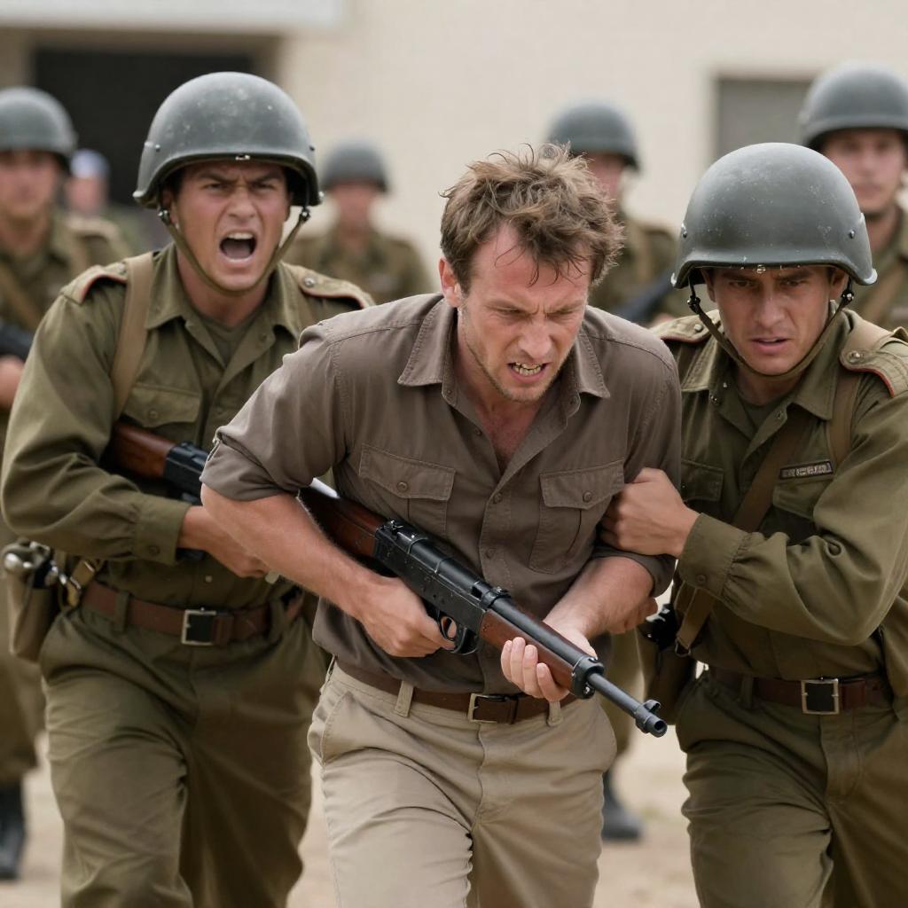 Dramatic scene of a man with disheveled brown hair wearing a brown shirt and beige pants being forcefully escorted by two soldiers in olive green uniforms and helmets. The soldiers carry rifles and have intense, determined expressions, indicating a tense military situation. Blurred figures and a beige building are visible in the background, emphasizing the focus on the confrontation.