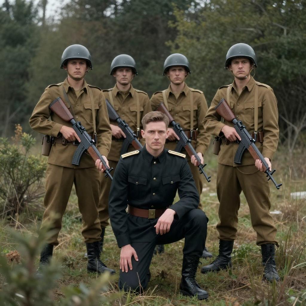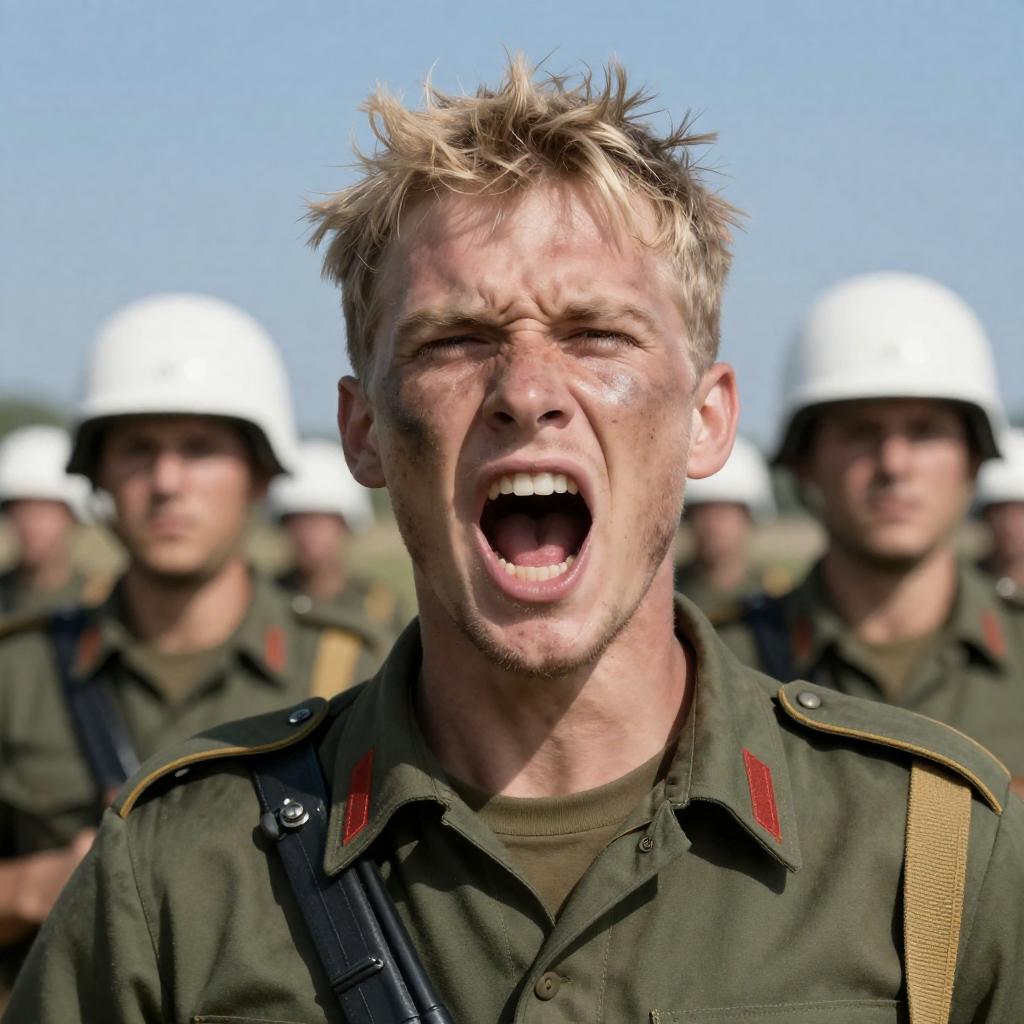 Photograph of intense military action scene. Central man with disheveled brown hair, brown shirt, and beige pants, being dragged by two soldiers in green uniforms and helmets. Soldiers hold rifles, faces determined. Background includes blurred people and beige building. Multiple soldiers, intense expressions. Soldier on left yells, soldier on right pushes. Central man's expression is strained.