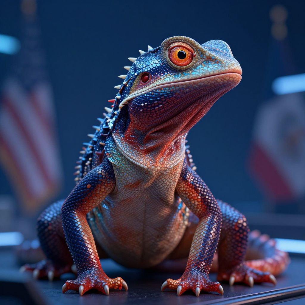 A highly detailed, digital CGI rendering of a vibrant, colorful iguana. The iguana has a strikingly iridescent blue and red-scaled body with a textured, scaly surface. Its large, orange eye is prominently visible, and it has small, white, spiky crests along its back. The background is a blurred, dark blue, with out-of-focus American flags on the left and right sides. The iguana is seated on a black, flat surface, with its front legs slightly spread out. The lighting emphasizes the iridescence and texture of its scales, creating a realistic yet fantastical appearance.