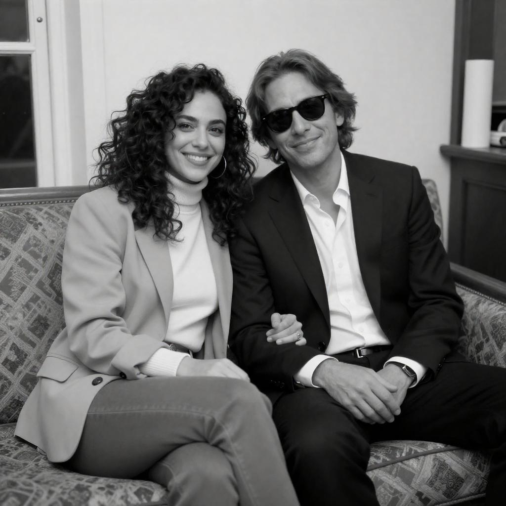 Black and white photograph of two people sitting on a patterned couch. Woman with voluminous dark hair, light jacket, white turtleneck, smiling, leaning on man. Man with long hair, dark sunglasses, black suit, white shirt, holding woman's hand, smiling. Background includes door, paper rolls, and window. Both wear casual yet stylish outfits. Woman's right hand rests on man's knee. Man's left arm around woman's waist. Casual, relaxed atmosphere.