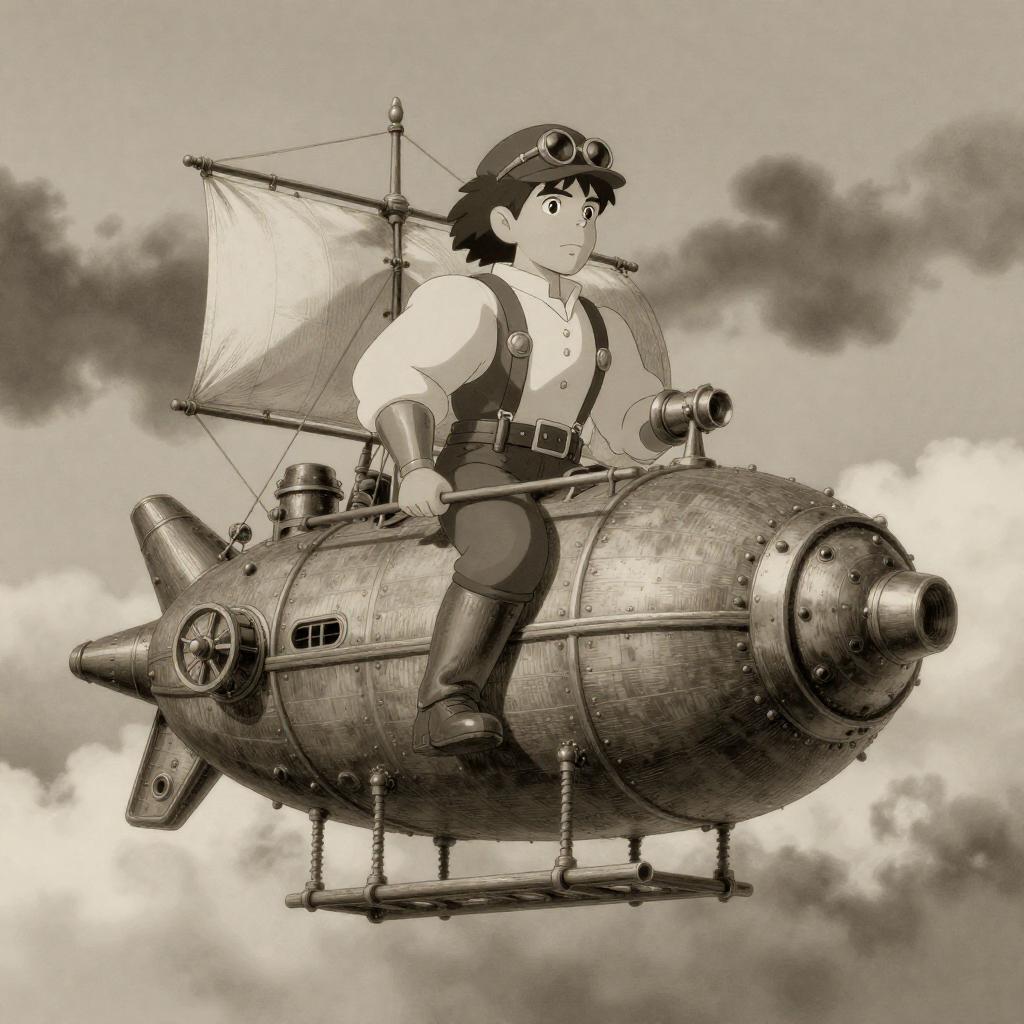 A daring sky pirate, wearing steampunk-inspired leather jacket with goggles, brandishing a cutlass while riding an airship, amid swirling clouds over a floating island, illustrated in the dynamic and action-packed anime style of Masashi Kishimoto.