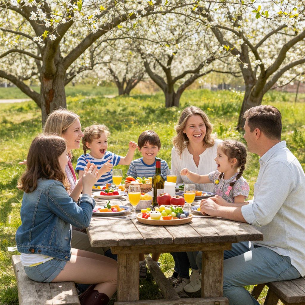Loving family gathered around a rustic wooden table for a joyful outdoor picnic, vibrant spring colors, laughing children playing, parents sharing warm smiles, sunlight filtering through blossoming trees, detailed textures of fresh food and nature