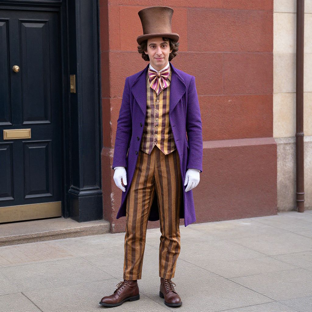 Willy Wonka Man Costume, dressed in a purple suit and top hat standing on a sidewalk