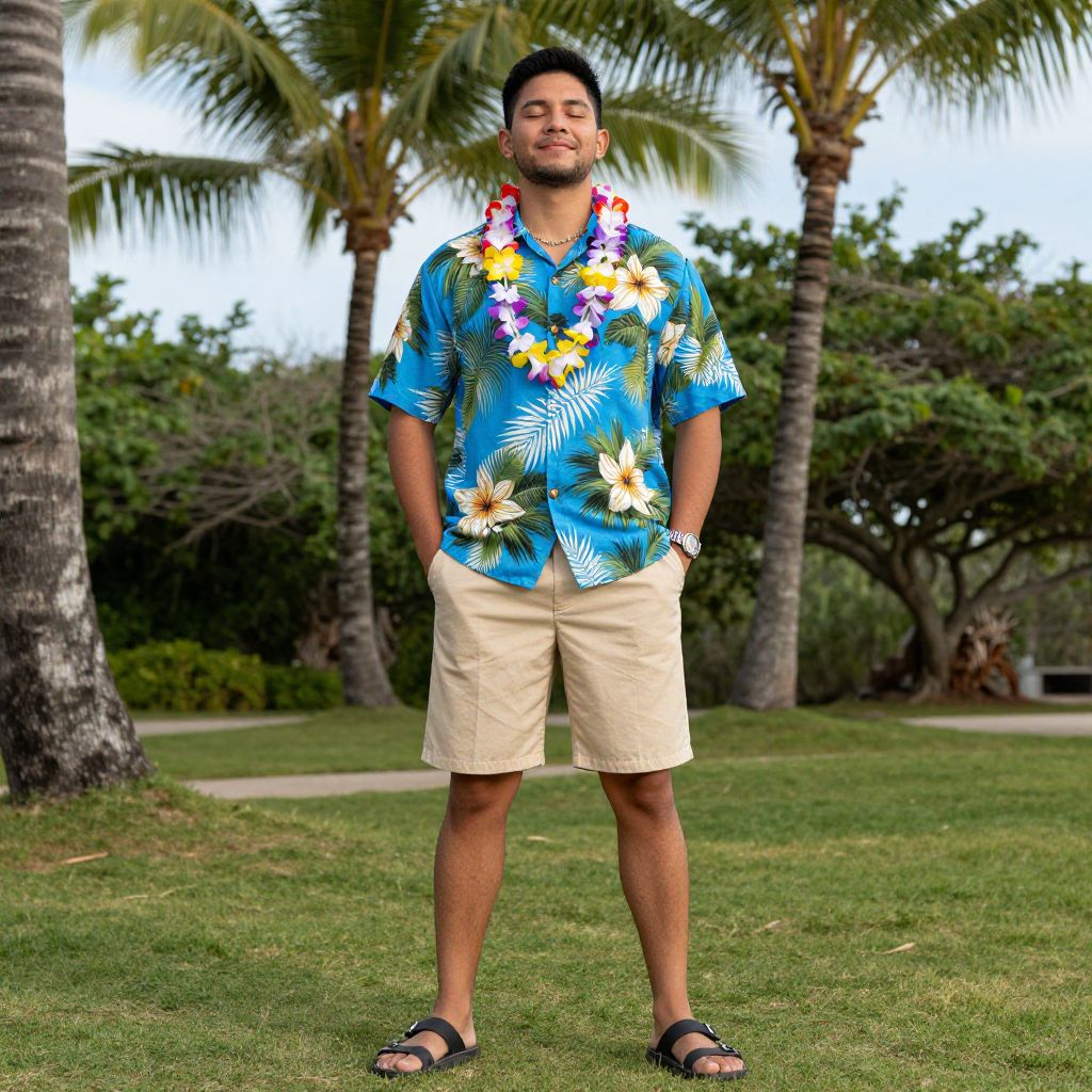 Photograph of a smiling man with short black hair, tan skin, wearing a blue floral shirt, beige shorts, black sandals, and colorful lei,