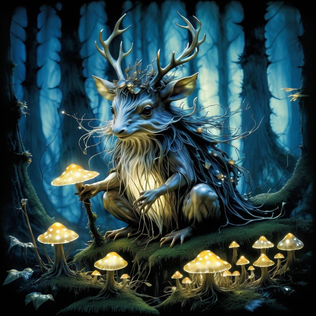 Isolated whimsical forest creature in high detail with glowing mushrooms effects by Brian Froud, Arthur Rackham.